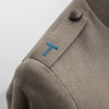 Ljusgrått tyg med ståndkrage och axelklaffar med ett stort T i blått, axelbredd ca 43 cm, ärmlängd ca 61 cm.