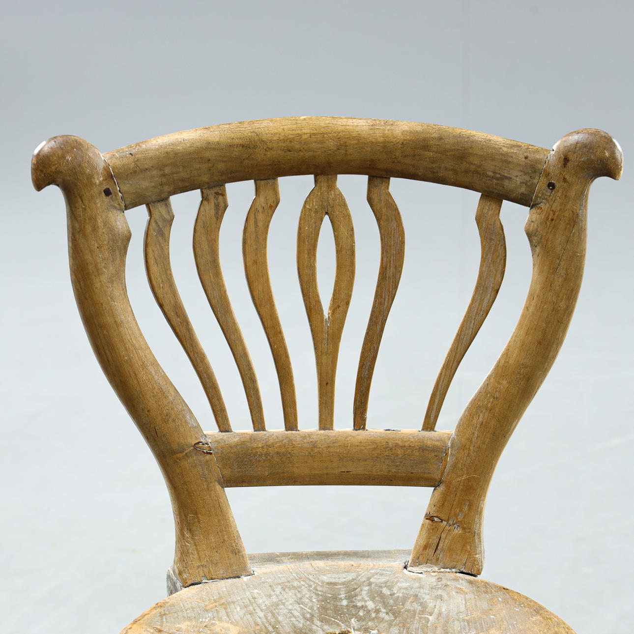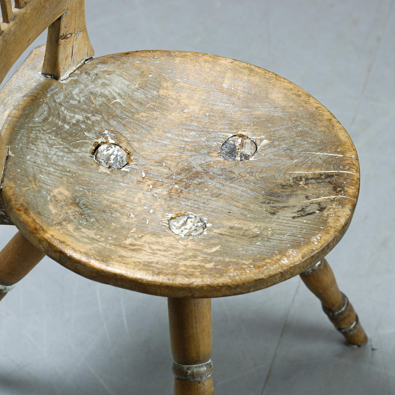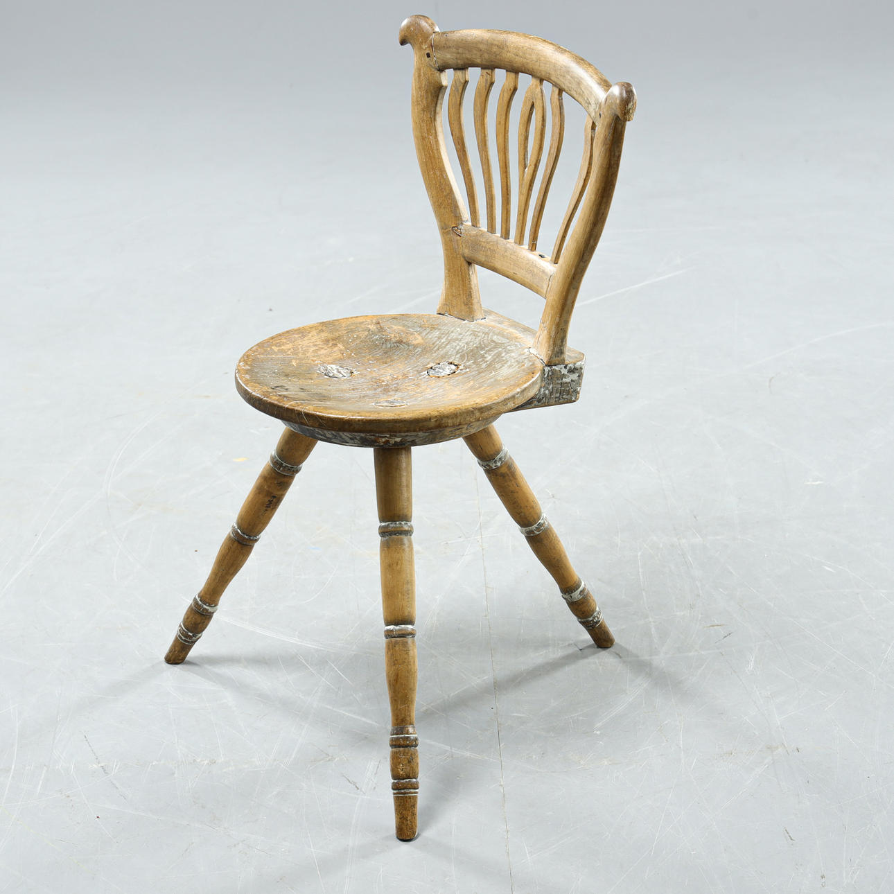 Slitage med träsprickor och avslag. En spjäla saknas. Något lösa ben i infästning.