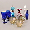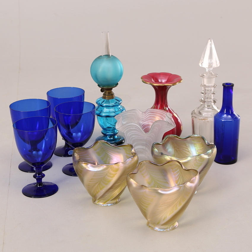 Blå flaska med smärre nagg, karaff med bottennagg, övrigt slitage.