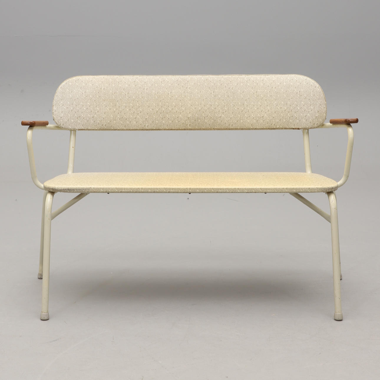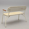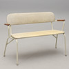 Beigelackerad stålrörsstomme, armstöd i teak, sits och rygg klädda i galon. Längd 115, sitthöjd 44 cm.