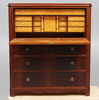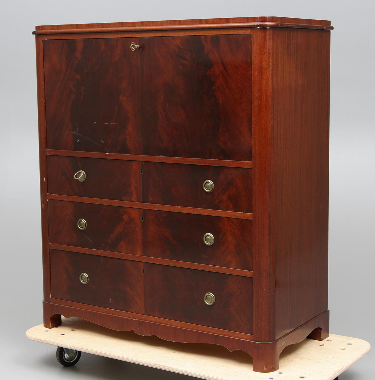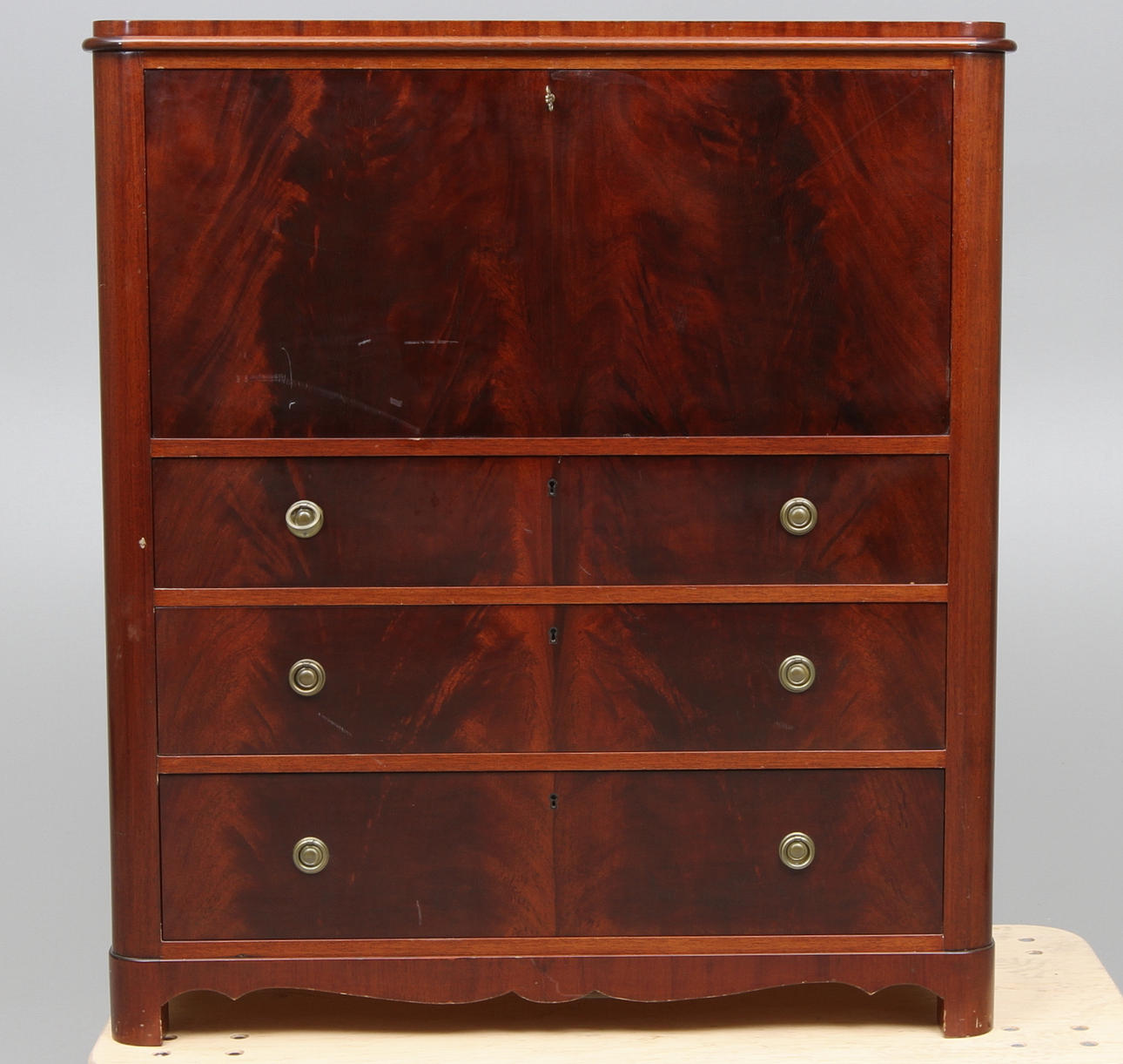Fanerad i mahogny, inredd bakom klaff med lådor fanerade i björkrot. Nyckel medföljer. Längd 101, bredd 46, höjd 115 cm.