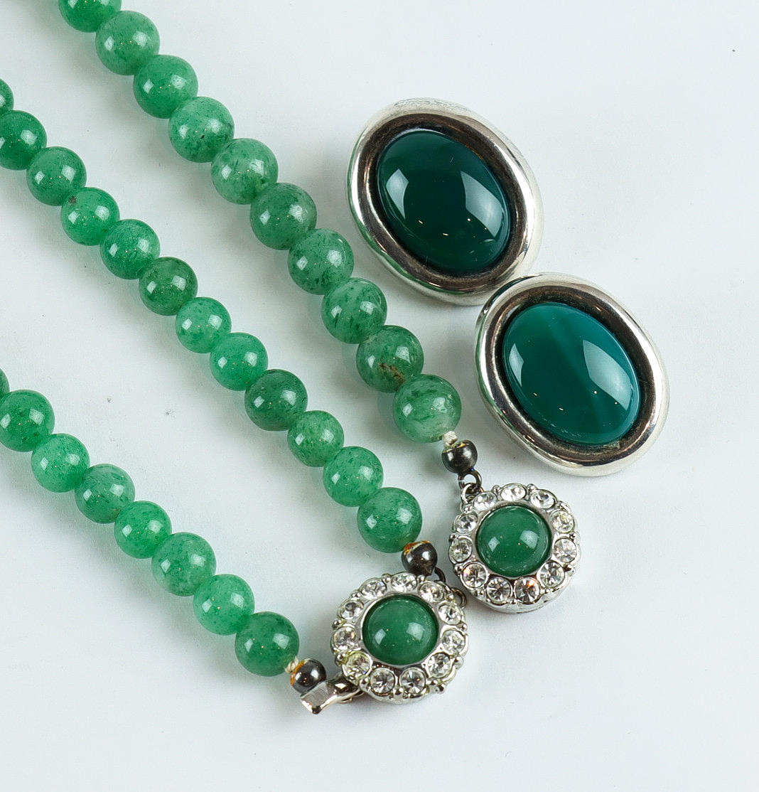 Vitmetall och Jade i arm och halsband,längd ca 19 och 70 cm.Örhängen Sterlingsilver stämplade Mexico.