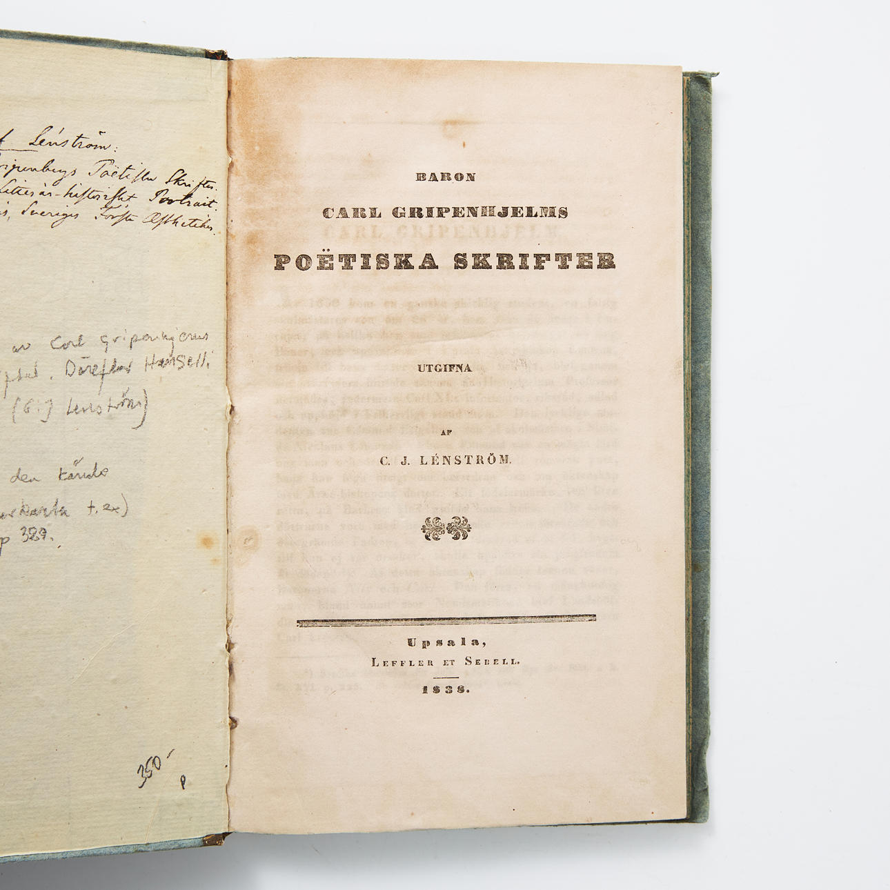 + GRIPENHJELM, CARL) - LÉNSTRÖM, CARL JULIUS (utg.). Baron Carl Gripenhjelms poëtiska skrifter. Uppsala, Leffler et Sebell, 1838.