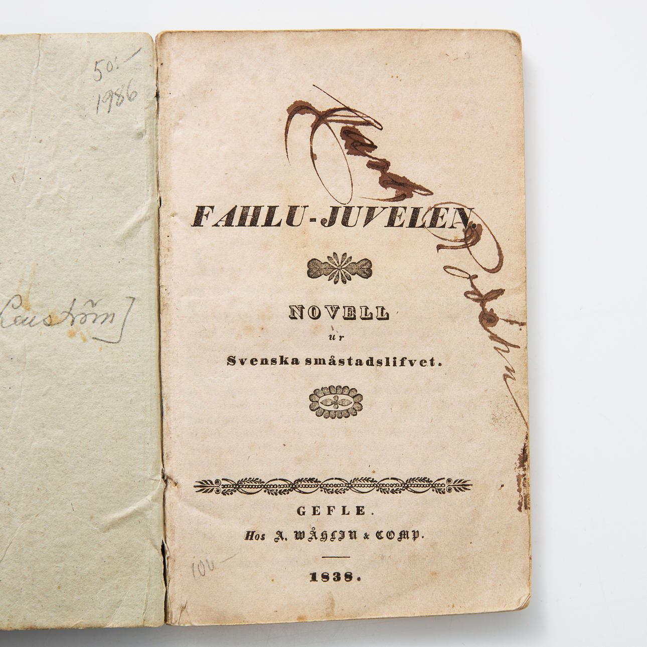 + (LÉNSTRÖM, CARL JULIUS). Fahlu-juvelen. Novell ur svenska småstadslifvet. Gävle, hos A. Wåhlin & Comp., 1838.