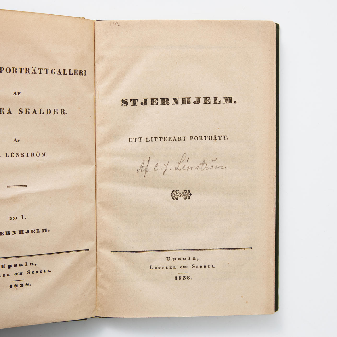 8:o. 211 x 125 mm. 47 s, Sammanbunden med: (LÉNSTRÖM, CARL JULIUS). Stjernhjelm. Ett litterärt porträtt. Uppsala, Leffler och Sebell, 1838.