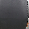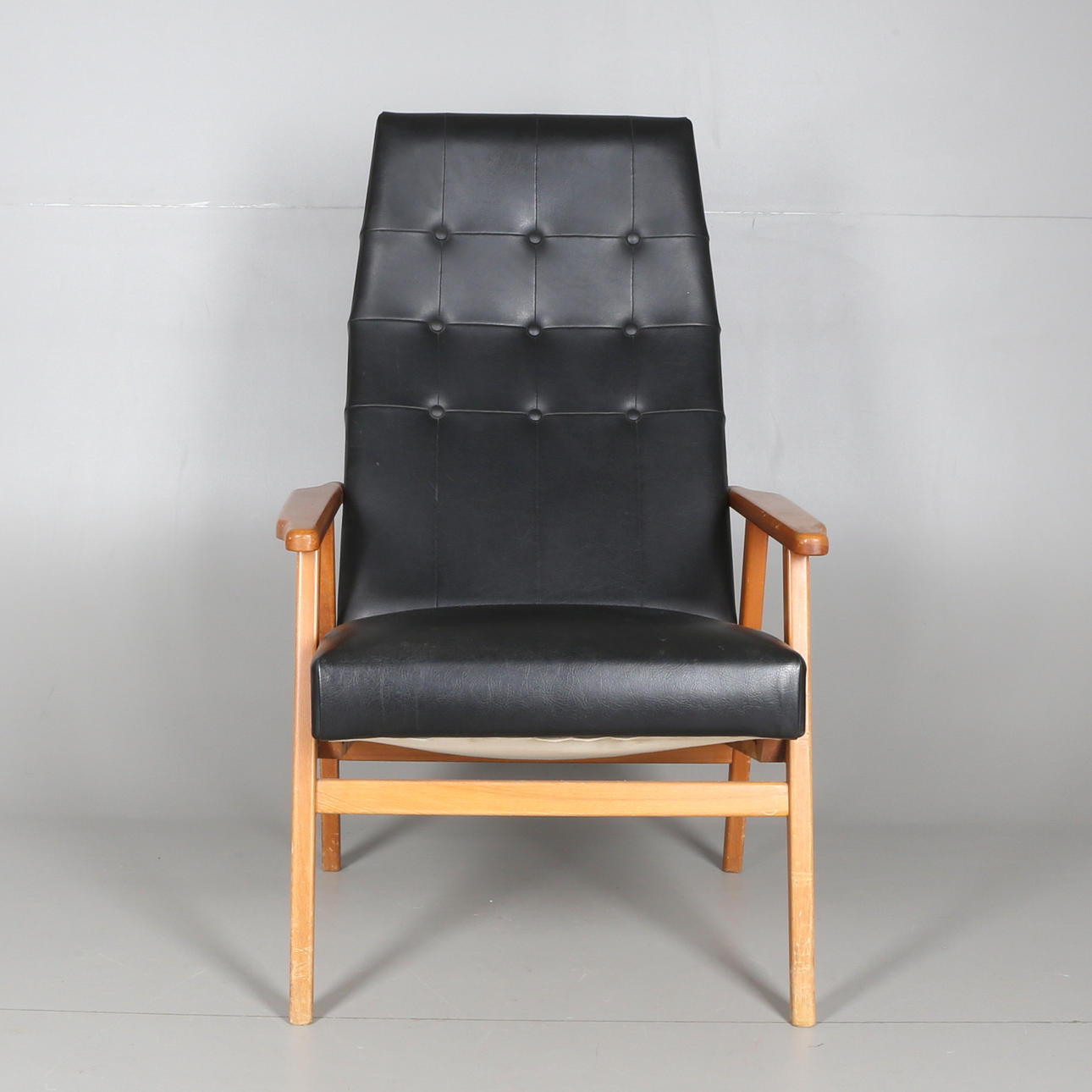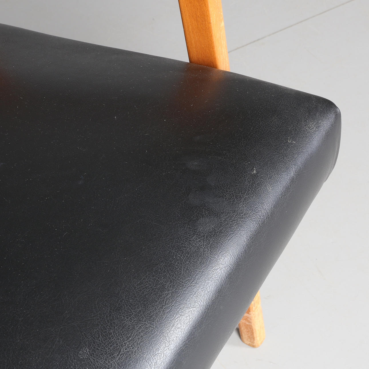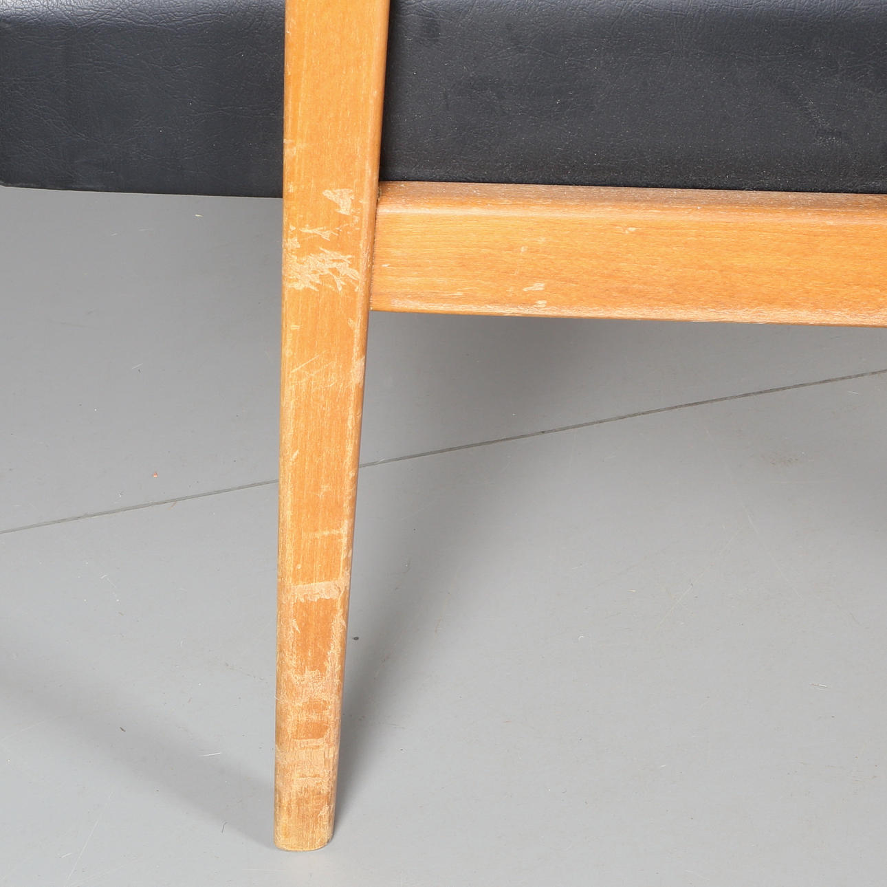 Fast stoppad rygg och sits klätt i svart skinn. Rygg häftad. Trästomme.