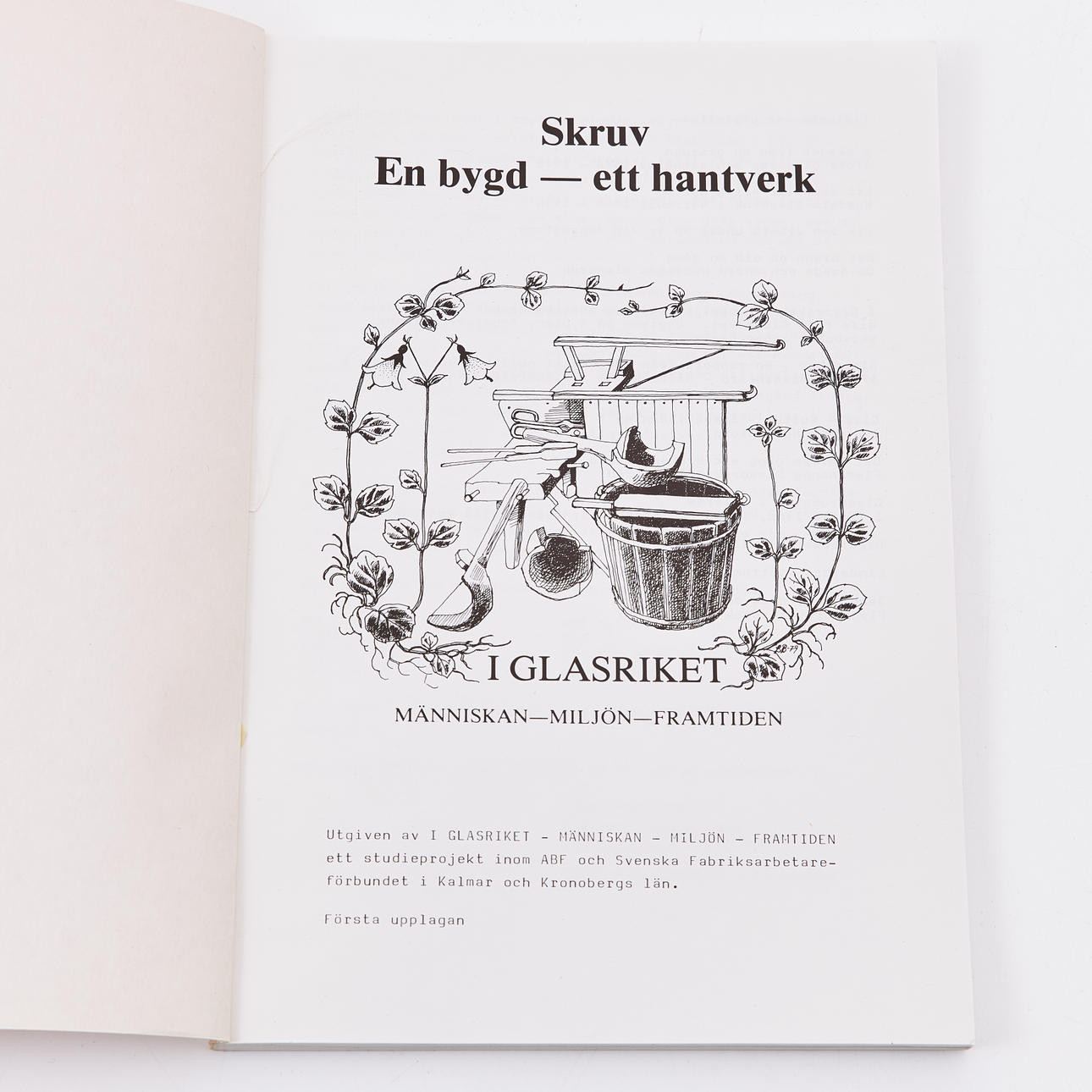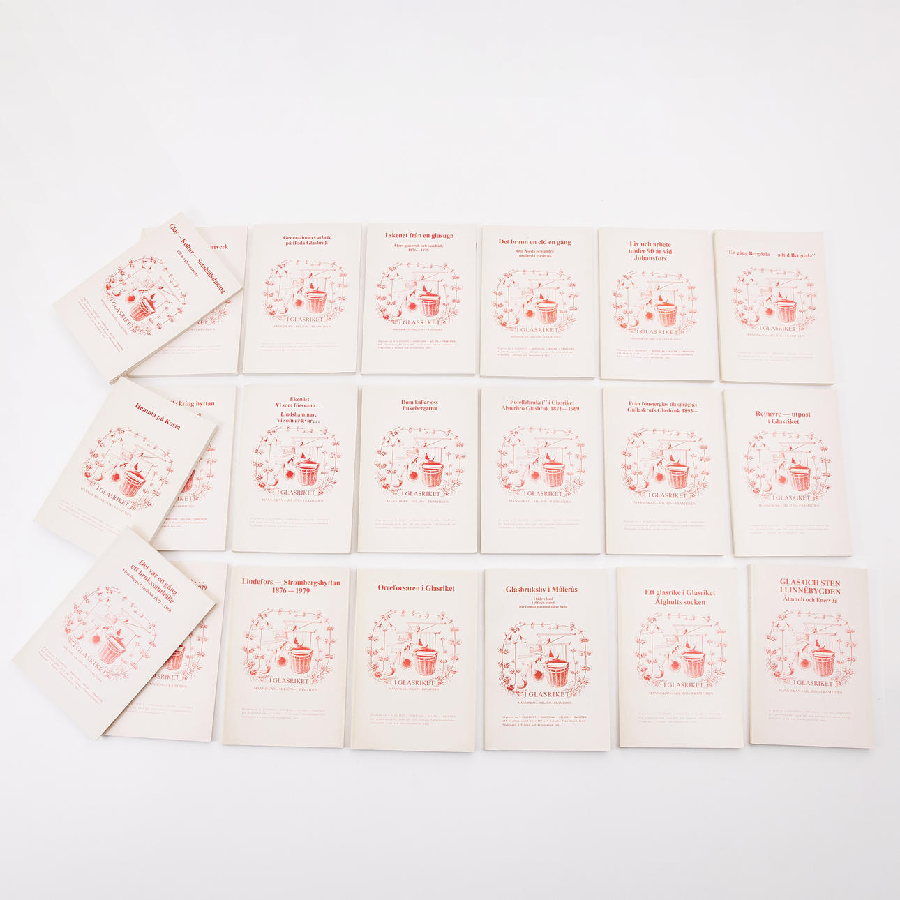 Parti omfattande samtliga 21 utgåvorna i serien I glasriket - människan - miljön - framtiden. Ett studieprojekt inom ABF och Svenska Frabriksarbetareförbundet i Kalmar och Kronobergs län. Lessebo och Emmaboda, 1978-84.