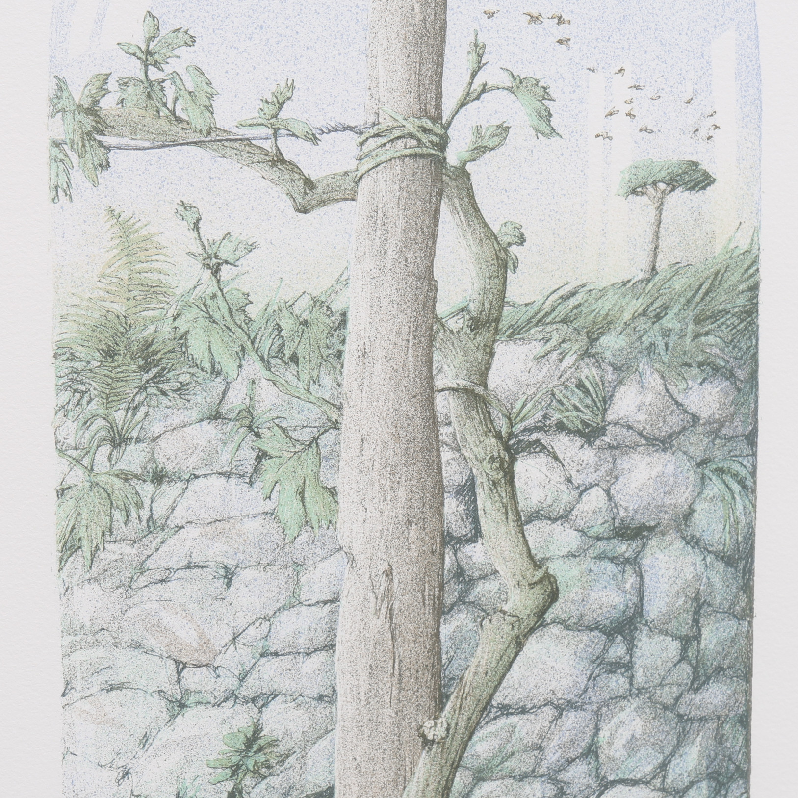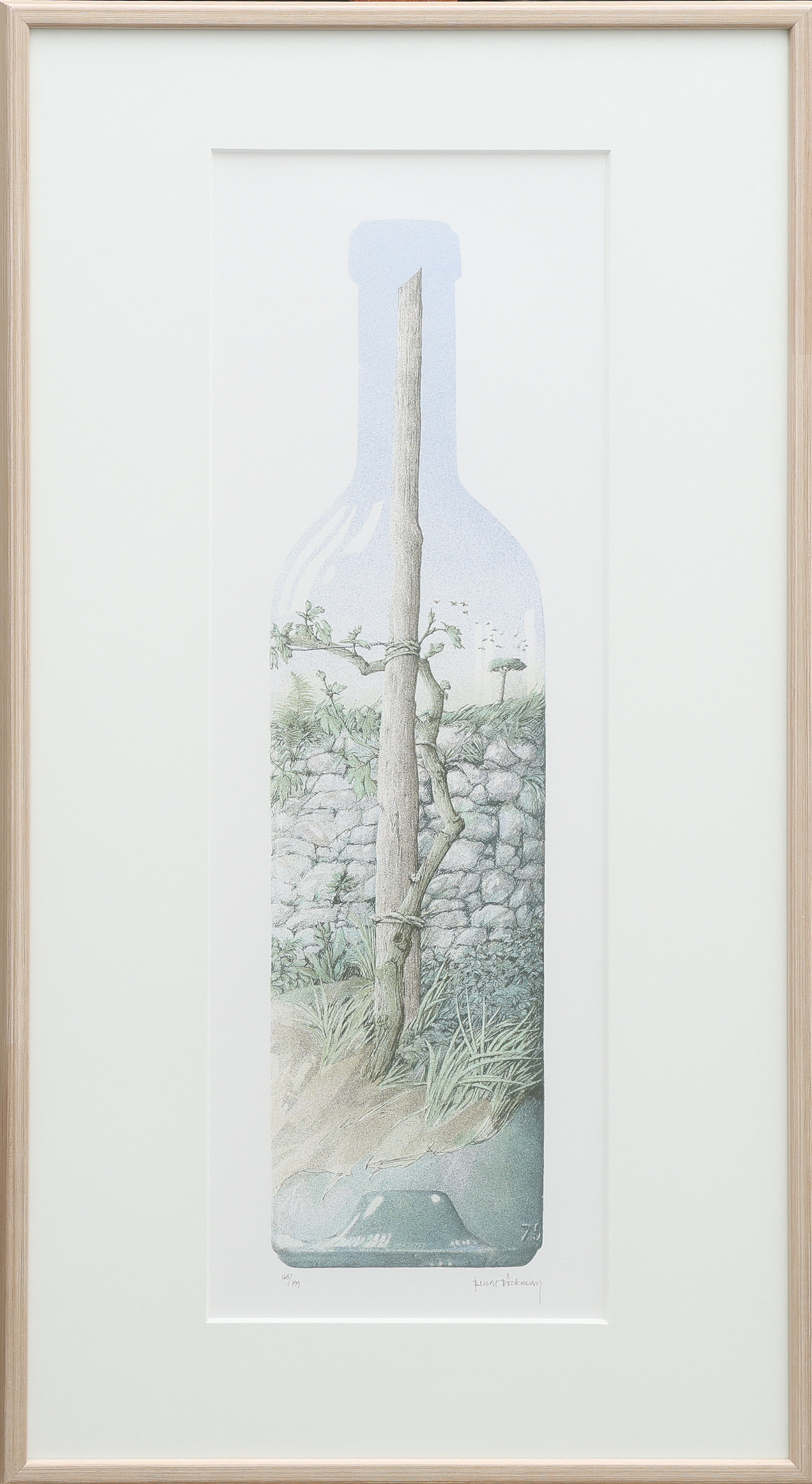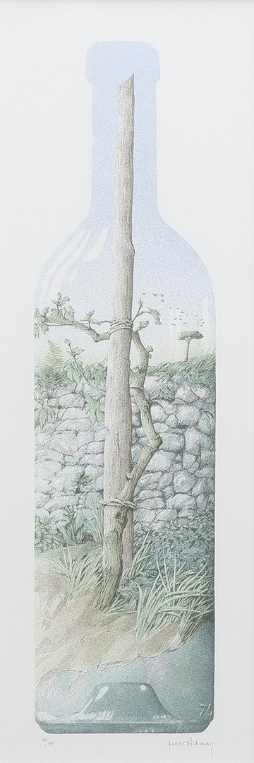 3333458. BENGT BÖCKMAN. KOMPOSITION MED TRÄD OCH FLASKA.