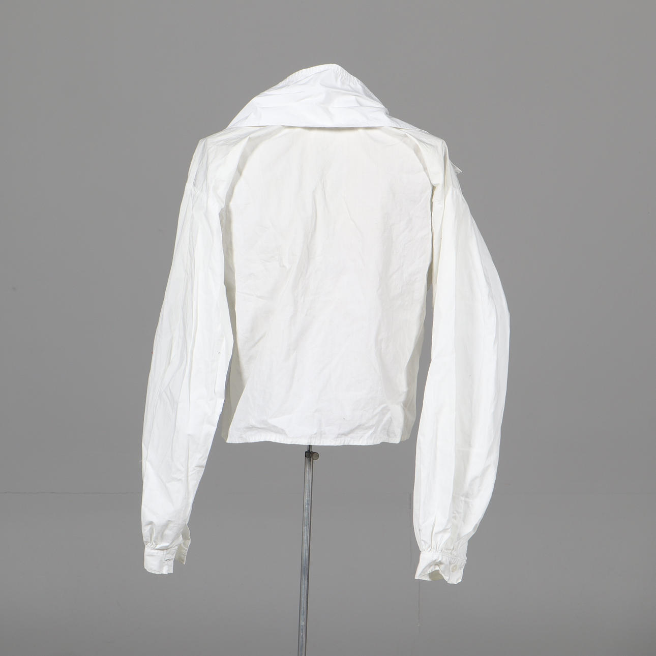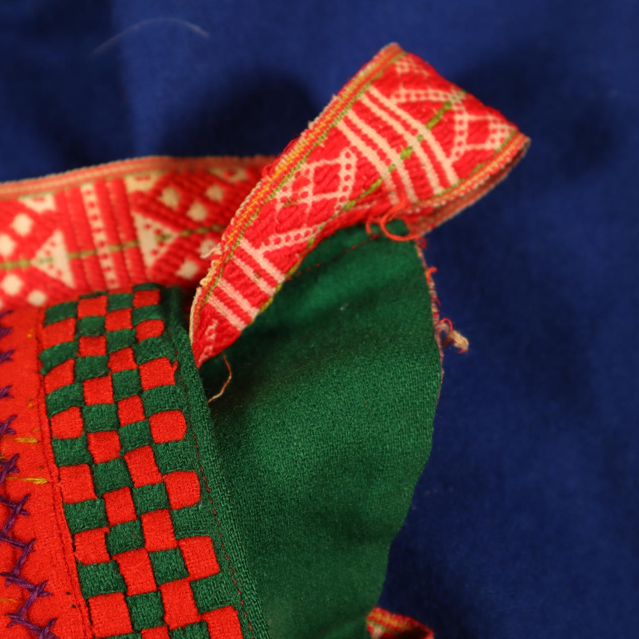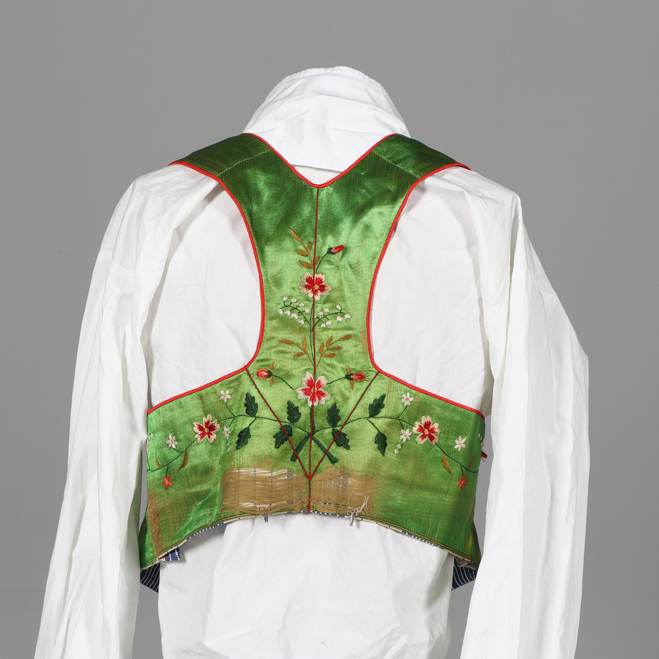 Bruksslitage. Väst i sämre skick. Sömmar som släppt ställvis, bland annat på väskan.
