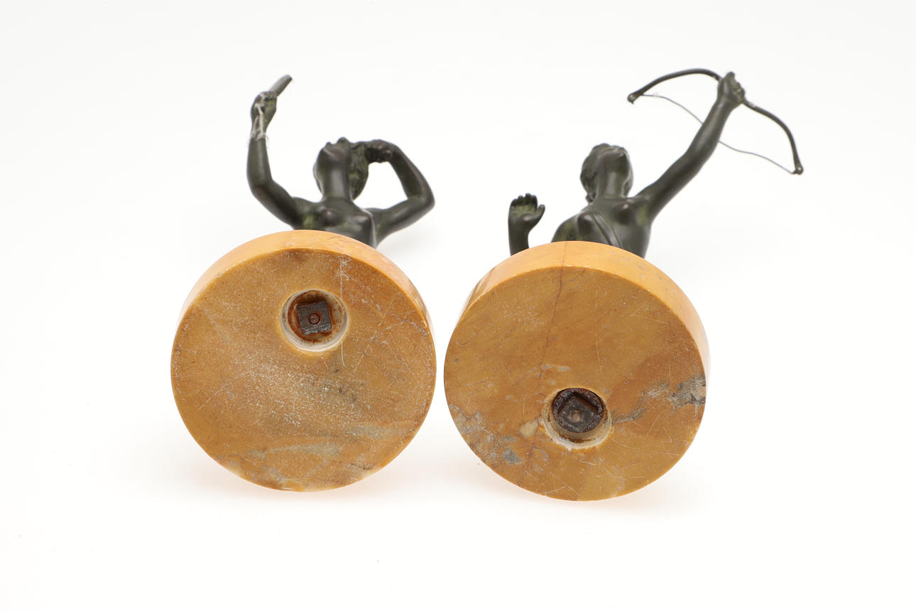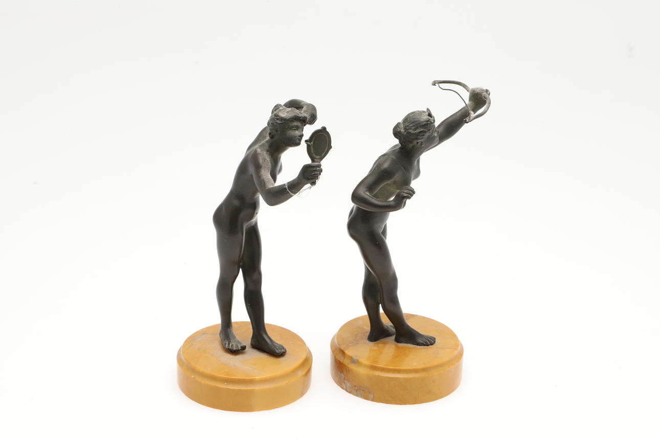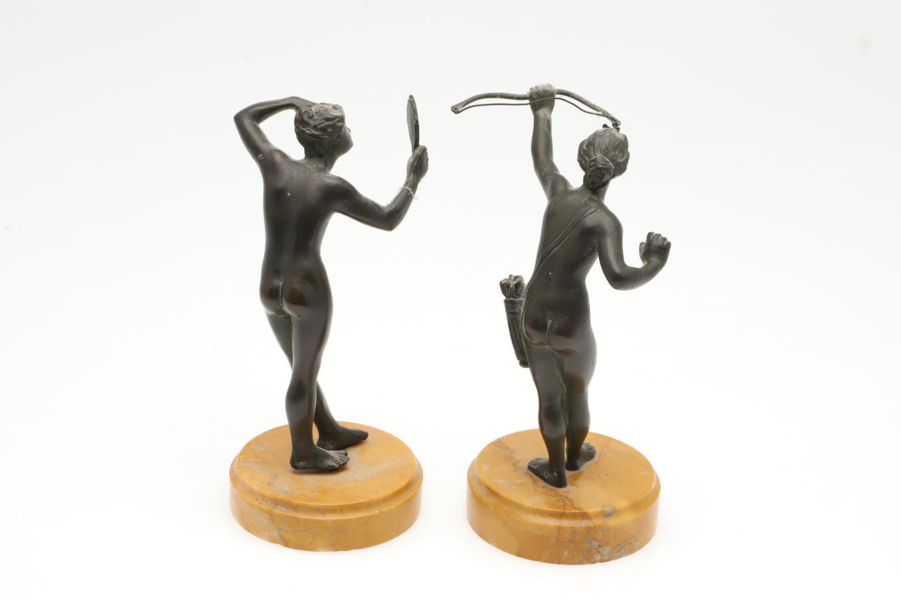 3342151. PAR SMÅ BRONSFIGURER PÅ MARMORBASER.