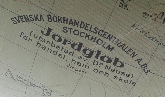 Klot på bonad träfot, höjd 59 cm. "Svenska bokhandelscentralen AB:s Jordglob(Utarbetad av D:r Neuse) för handel ,hem och skola.