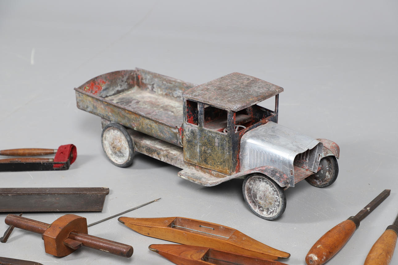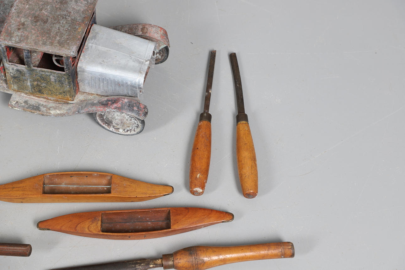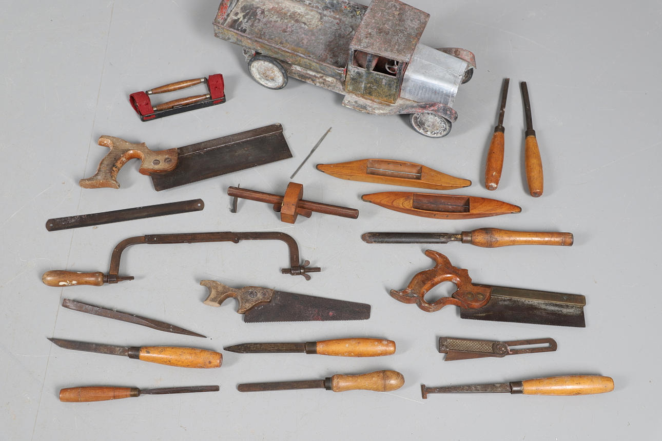 inklusive sågar och mejslar och två vävbussar, tillsammans med en tennleksaksstam från tidigt 1900-tal.