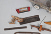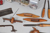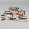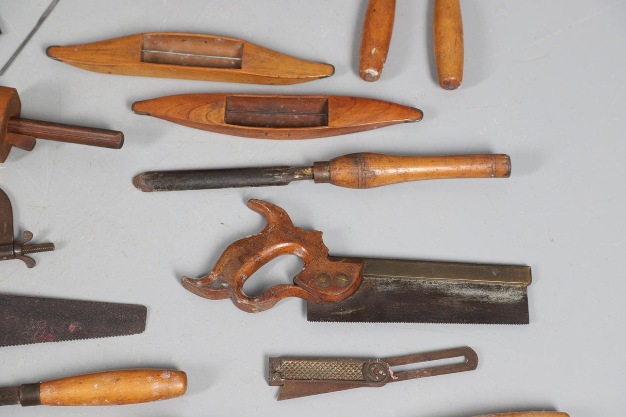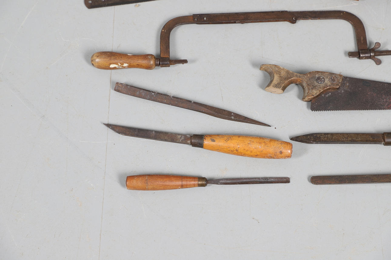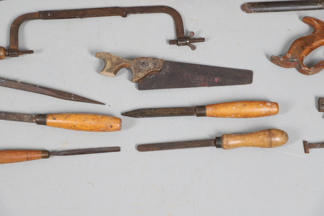inklusive sågar och mejslar och två vävbussar, tillsammans med en tennleksaksstam från tidigt 1900-tal.