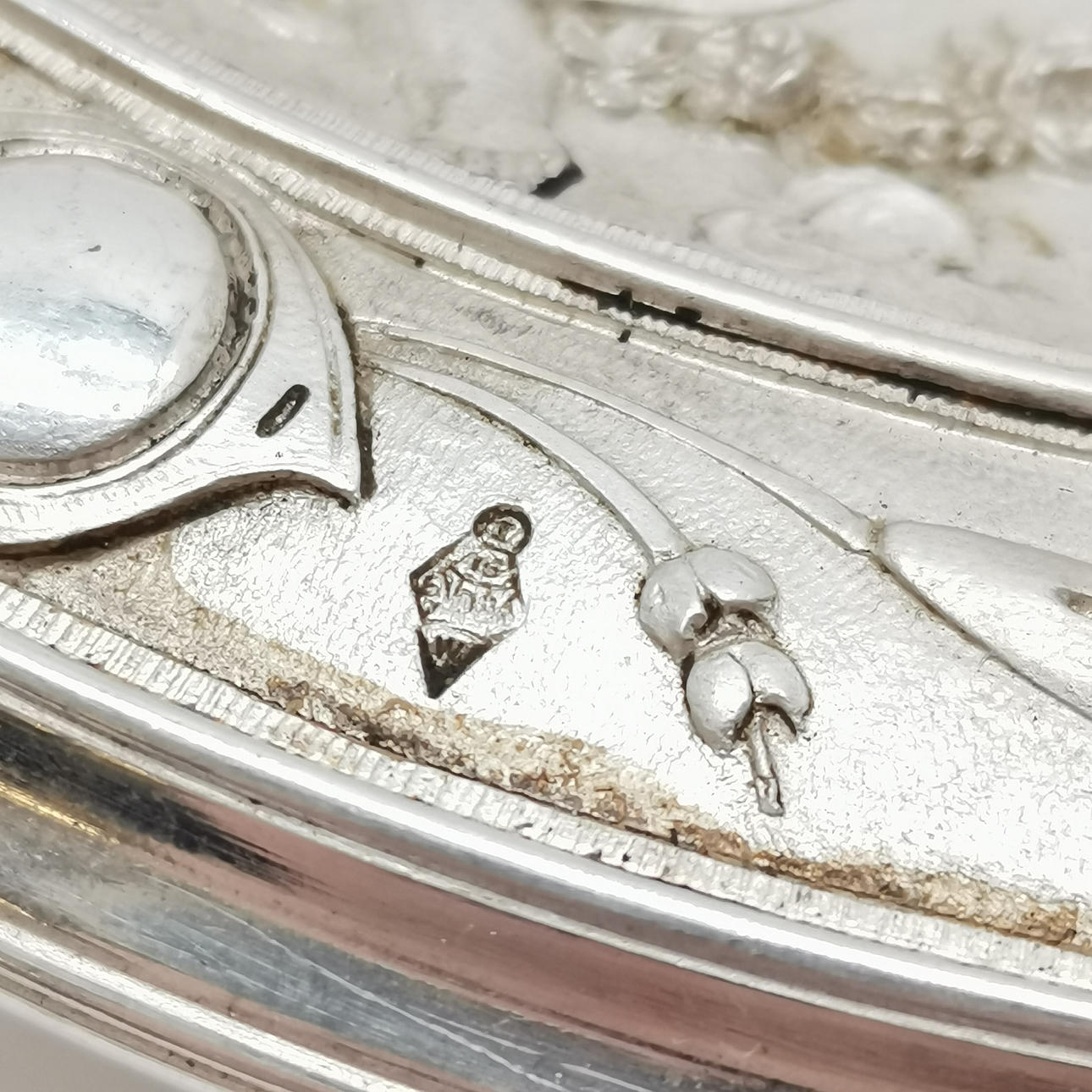 Antik Elkington och Co silverpläterad tazza - få ytskador annars i mycket gott ljust skick. Präglad dekoration av keruber - 20,5 cm diameter. Har registreringsdiamant.
