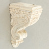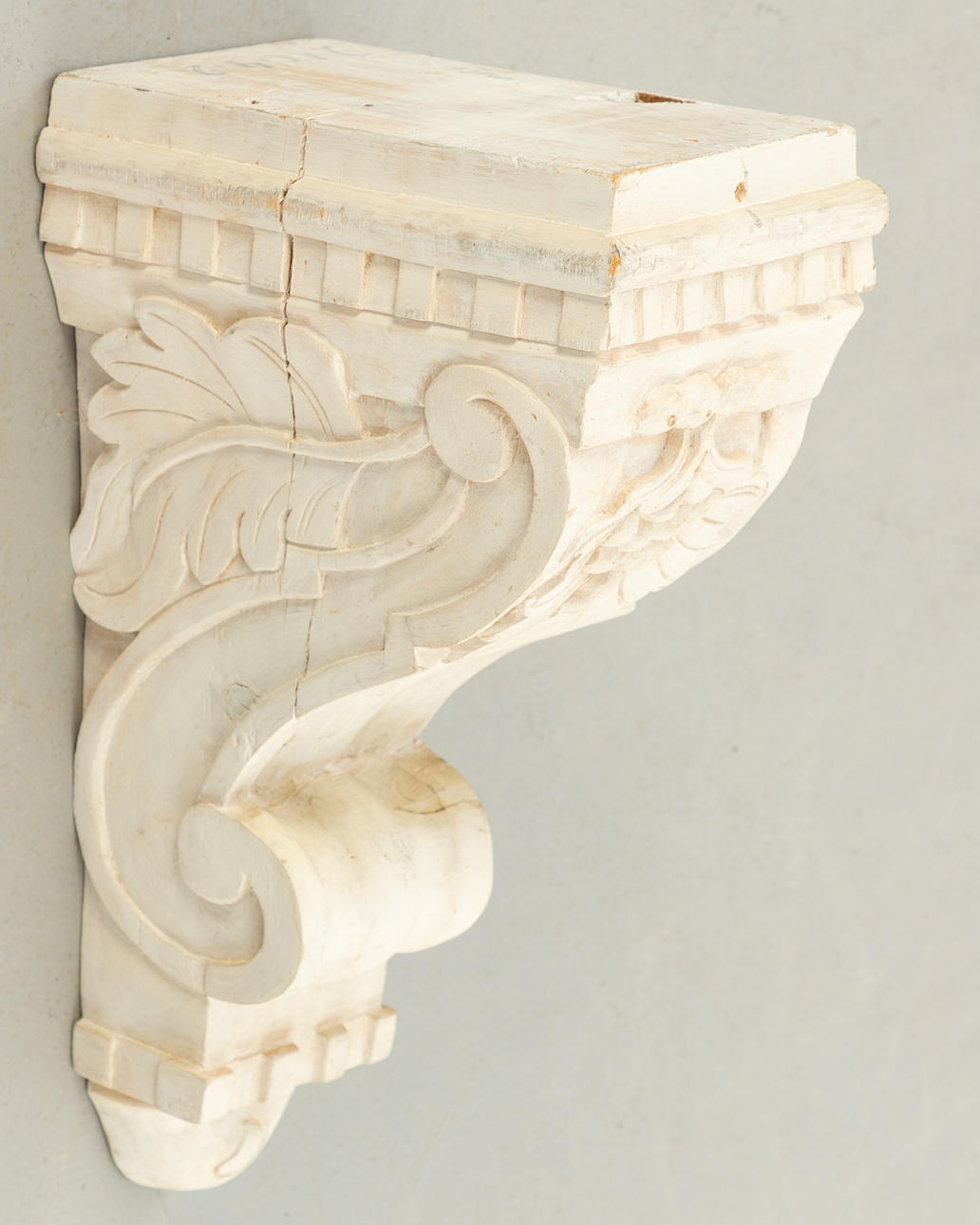 Trä, målad vit. Rektangulär, krökt form, med druvor och löv på framsidan, voluter och lövverk i relief på sidorna. HxBxD: ca. 51 x 20 x 30 cm.