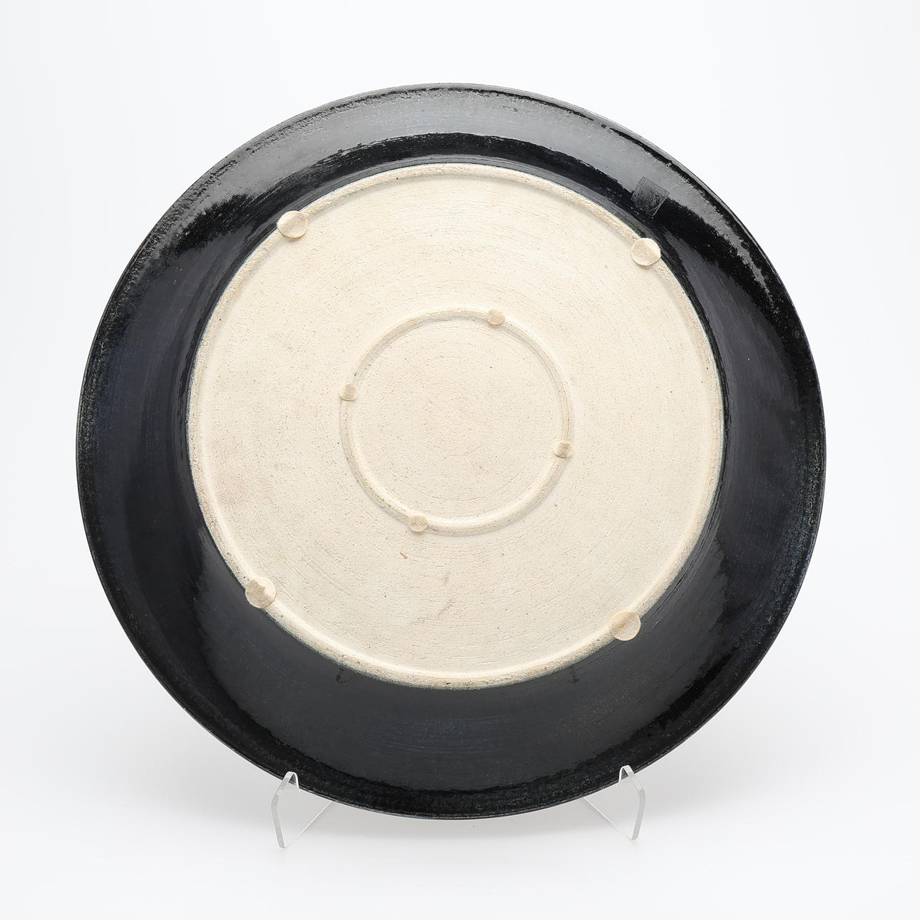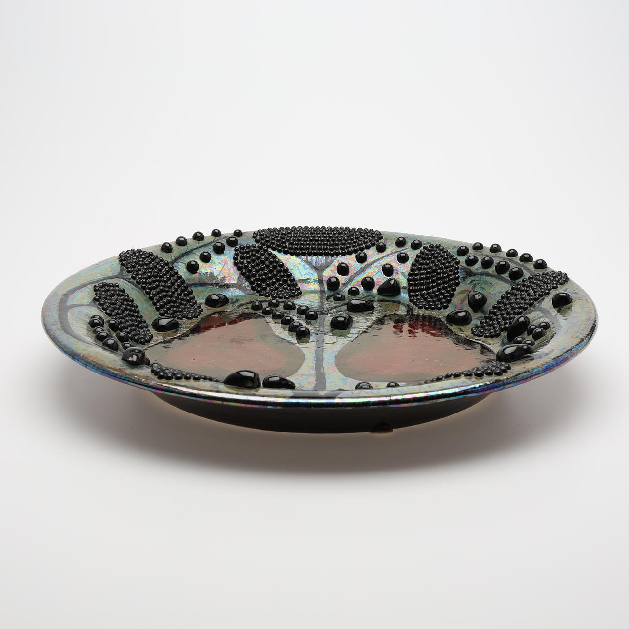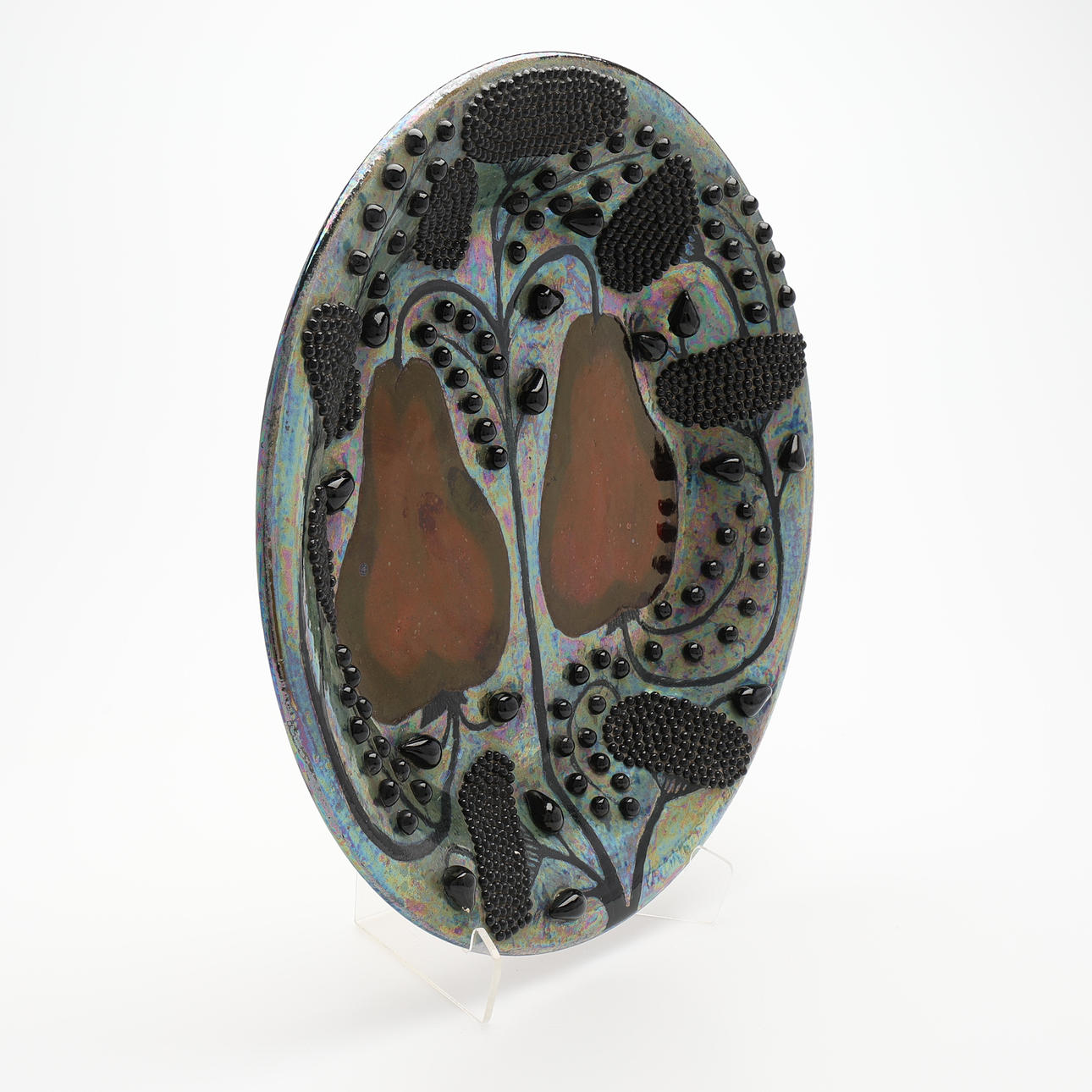 Signerat under glasyren "KAIPIAINEN ARABIA", stengods med iriserande glasyr samt målad och pålagd dekor föreställande päron och växtlighet, 1900-talets andra hälft, diameter 45 cm.