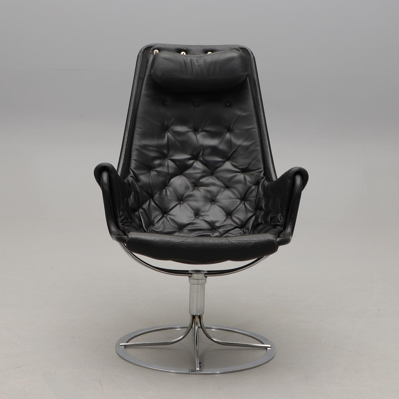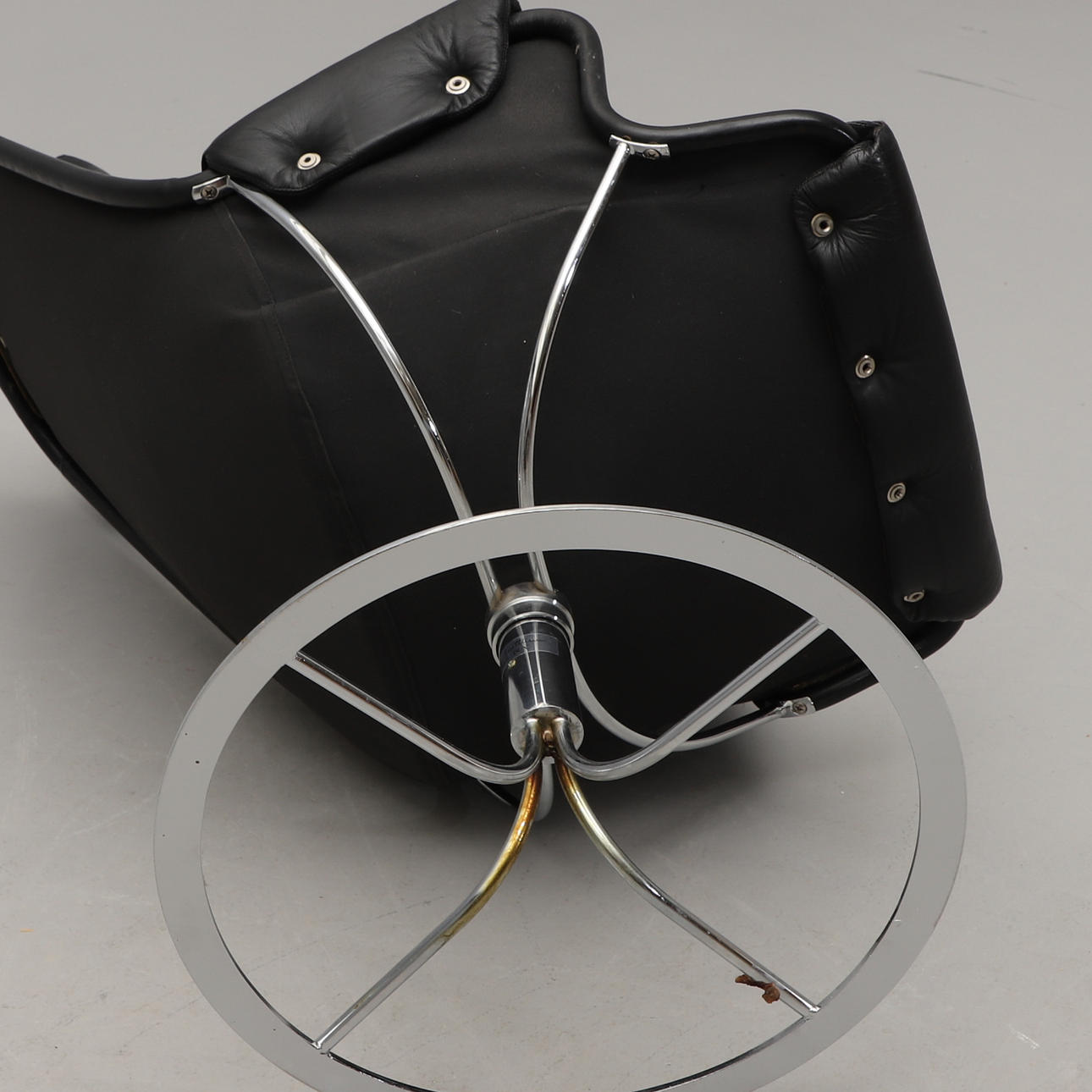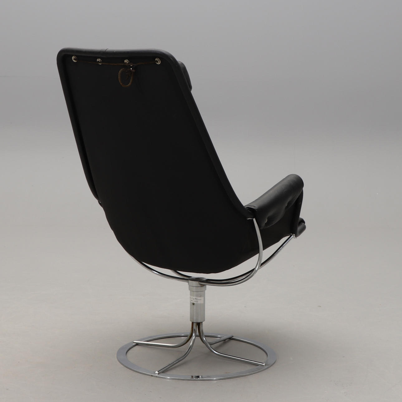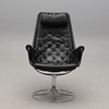 Snurrfåtölj med förkromat underrede. Svart skinnklädsel. Sitthöjd ca 40, rygghöjd 98, bredd 65 cm.