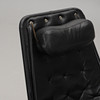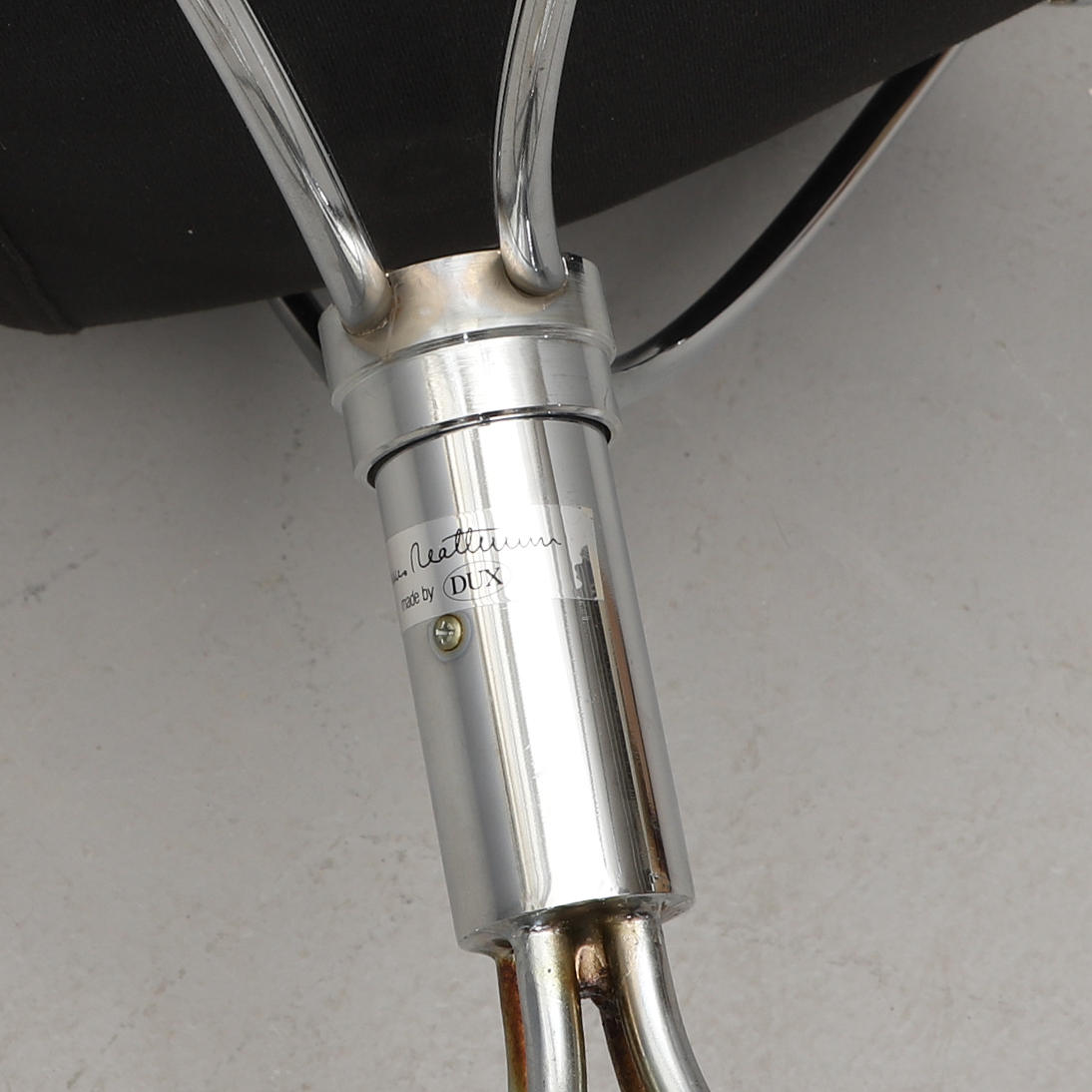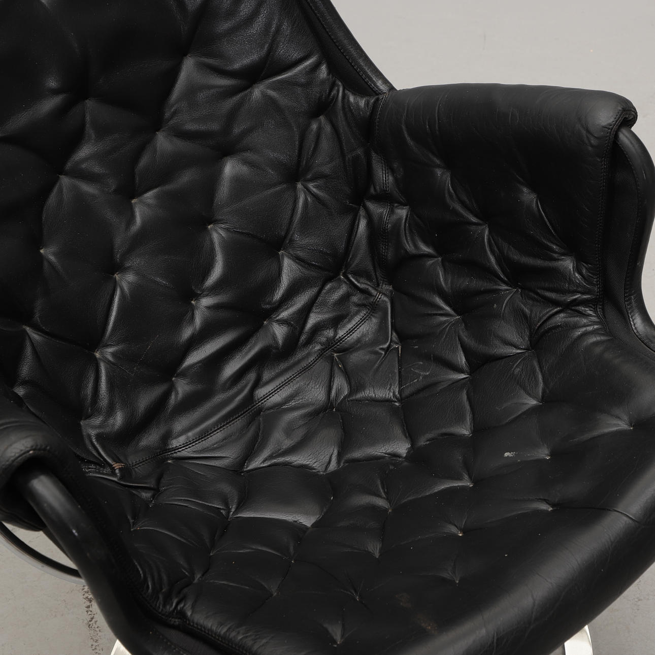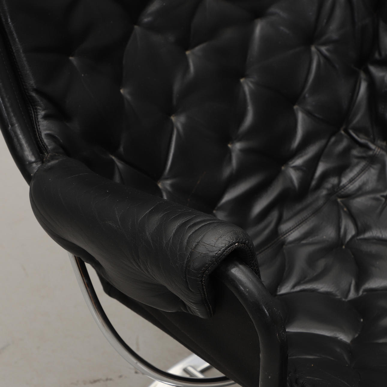 Snurrfåtölj med förkromat underrede. Svart skinnklädsel. Sitthöjd ca 40, rygghöjd 98, bredd 65 cm.