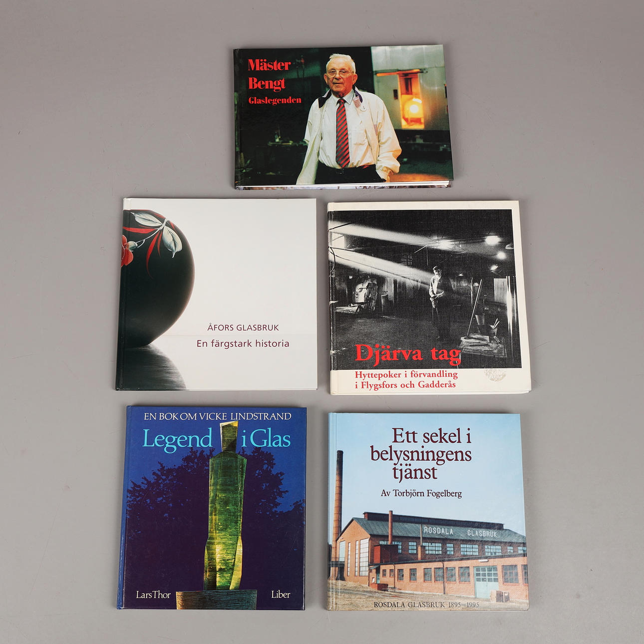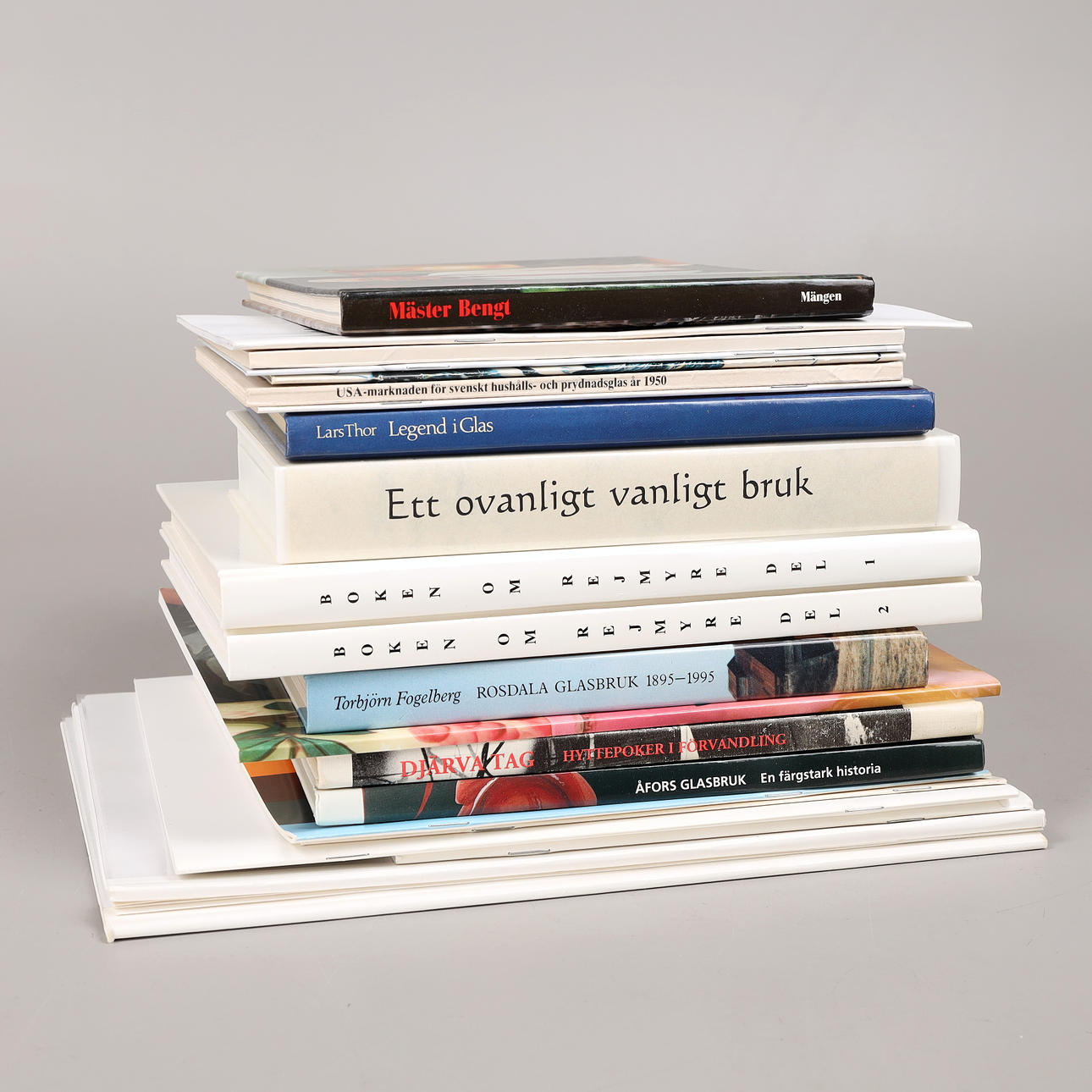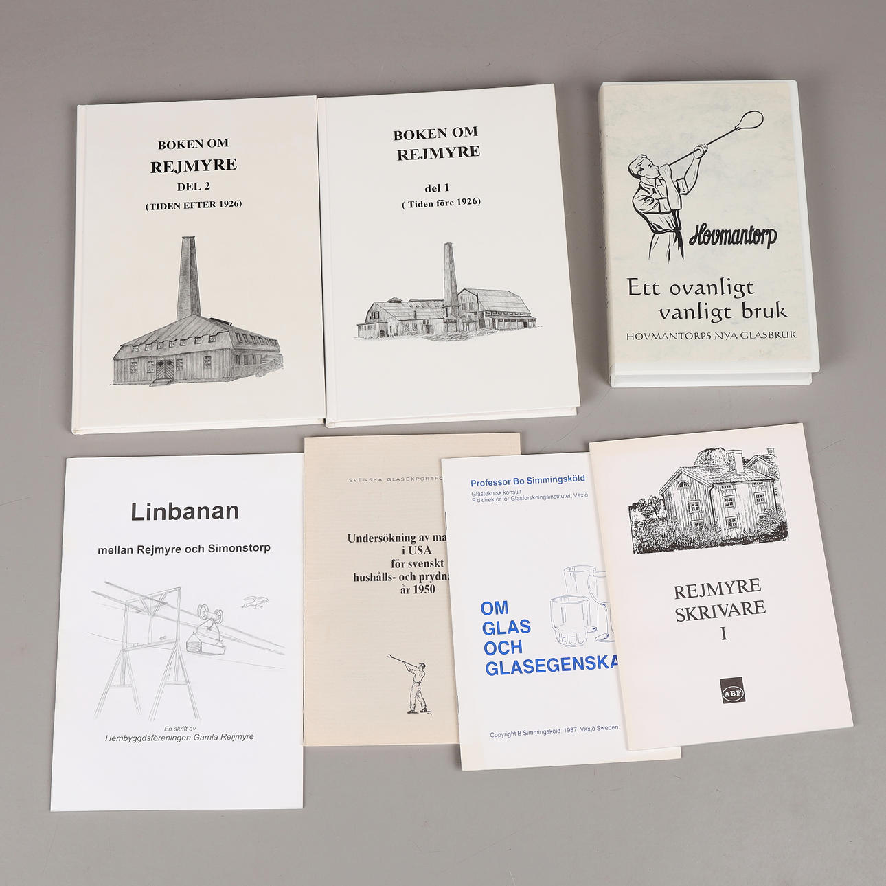 22 st böcker och häften om Sandvik, Reijmyre, Bergdala, Pukeberg, Strömbergshyttan, Åfors, Rosdala, Flygsfors mm. VHS-kassett om Hovmantorps Glasbruk.