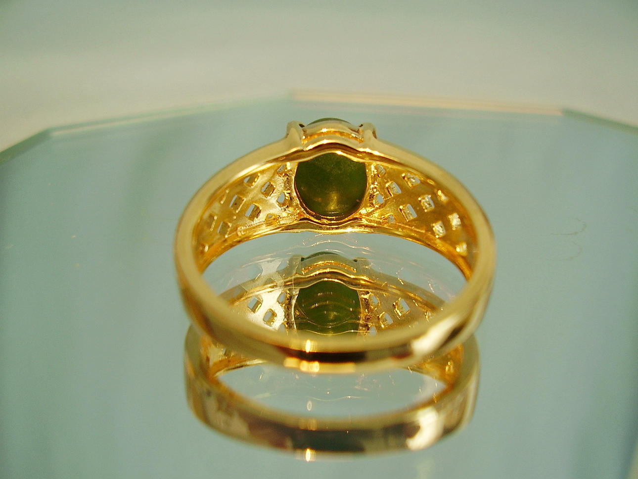 Ringhuvudet är inställt med en oval skoggrön jade cabochon av mycket fin färg och god kvalitet.