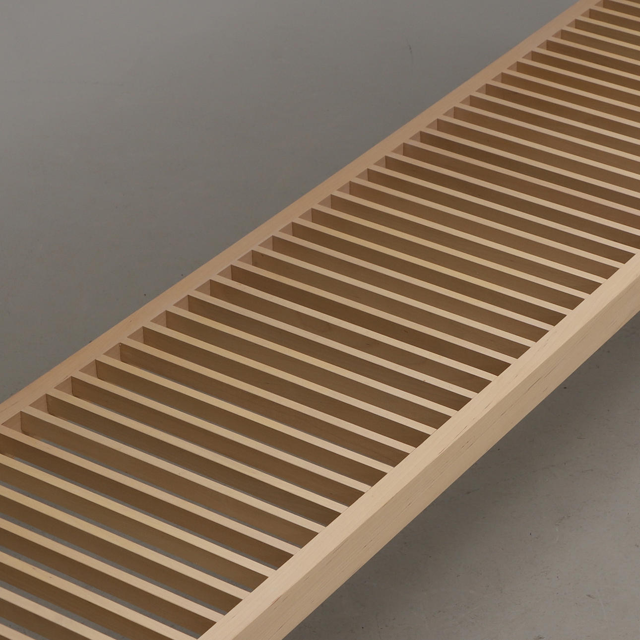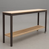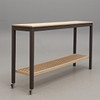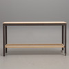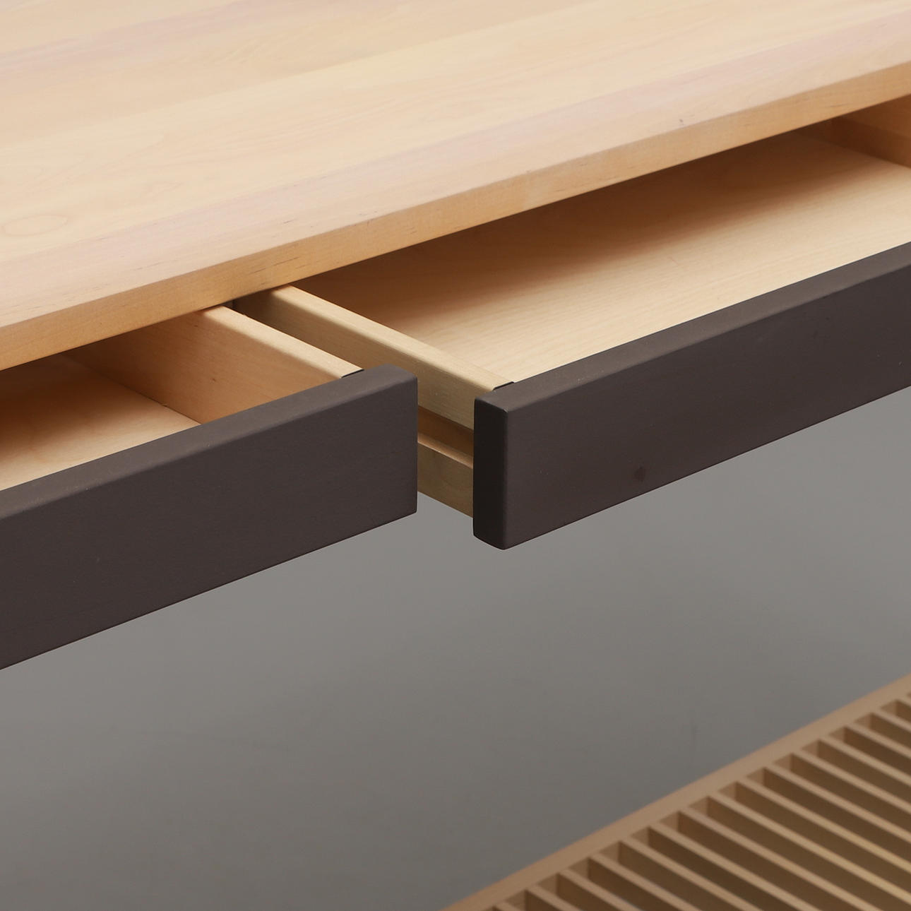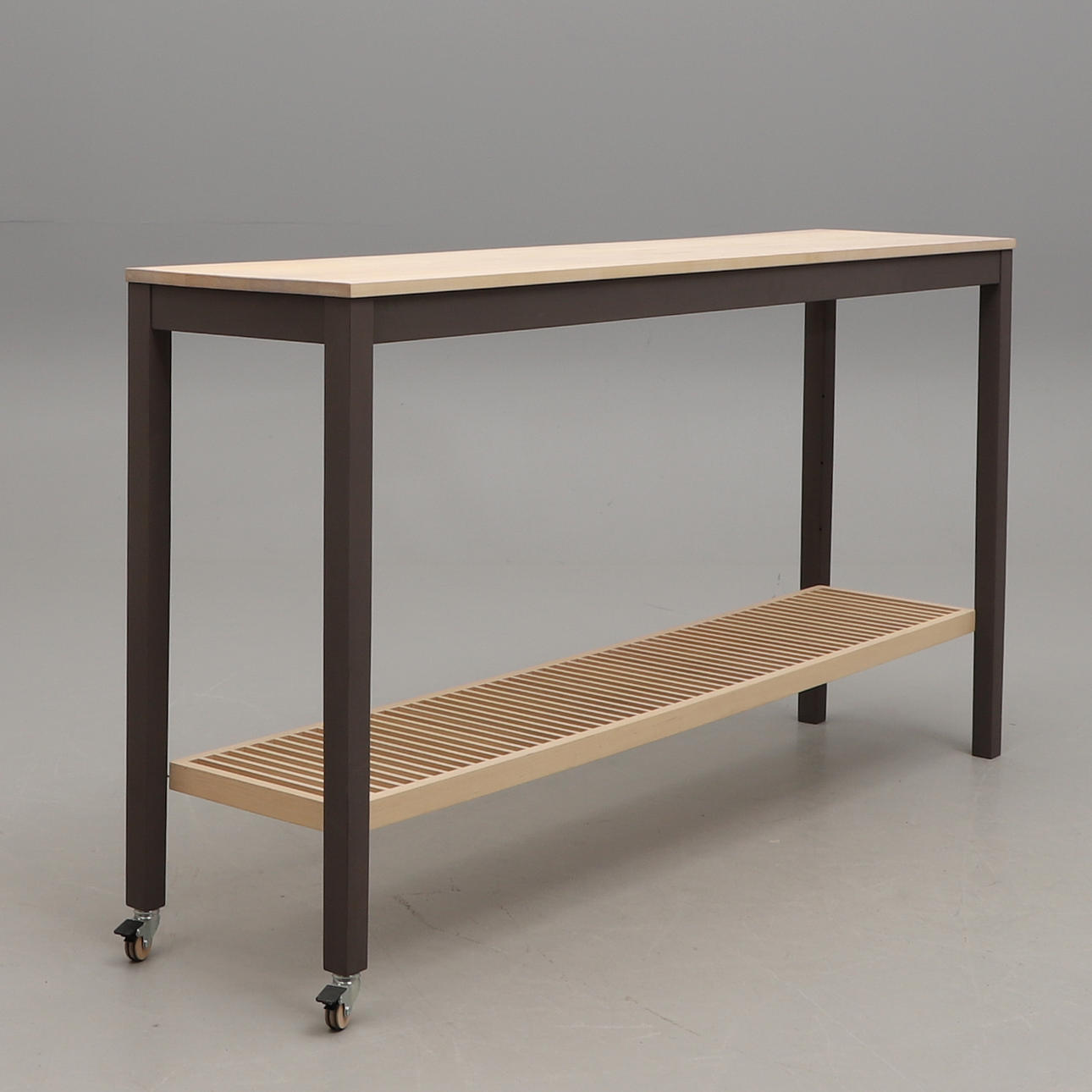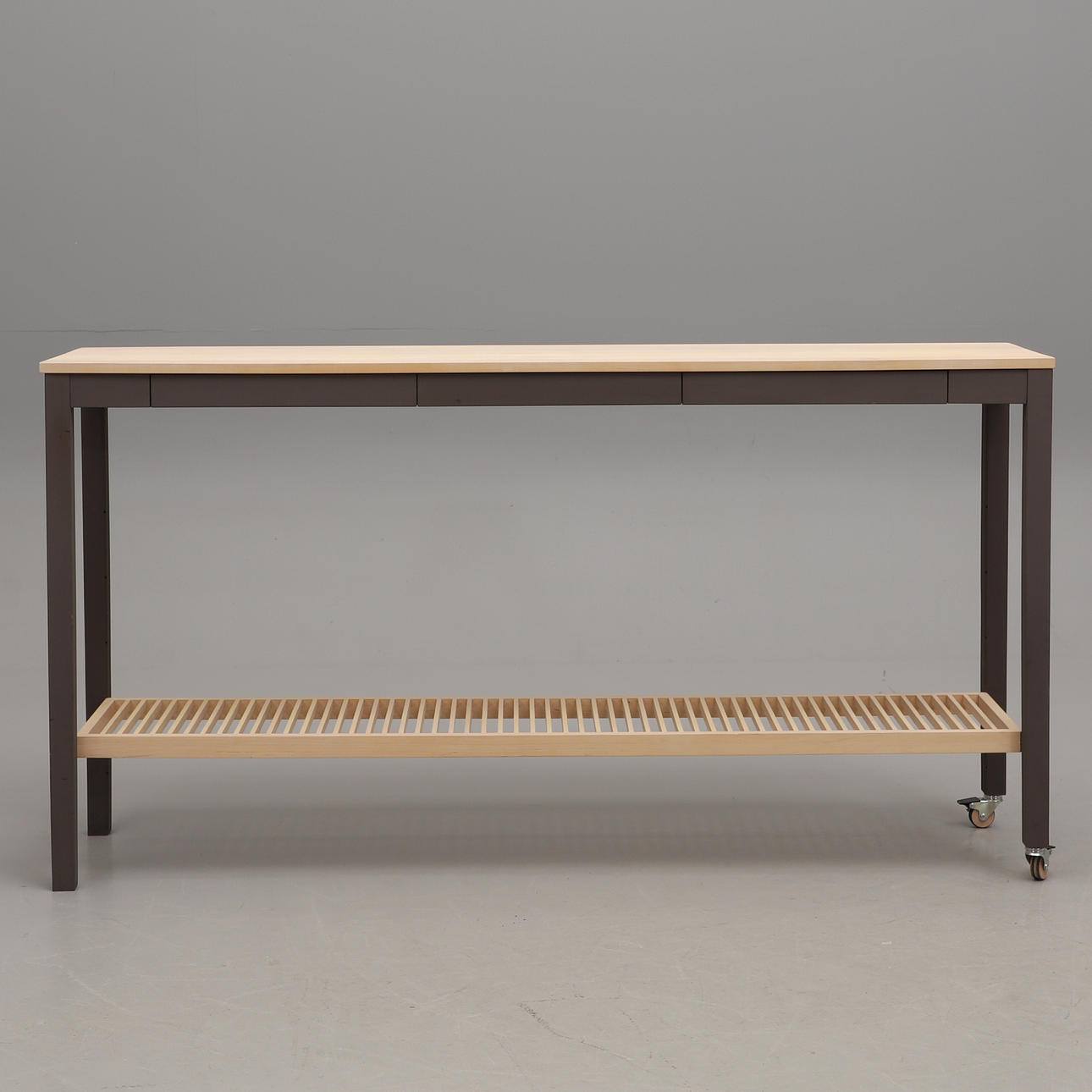 Ur serien "Multi". Björk, vitoljad och målad med äggoljetempera. Två ben på hjul. Tre lådor. Flyttbart hyllplan. Längd 180, bredd 42, höjd 95 cm.