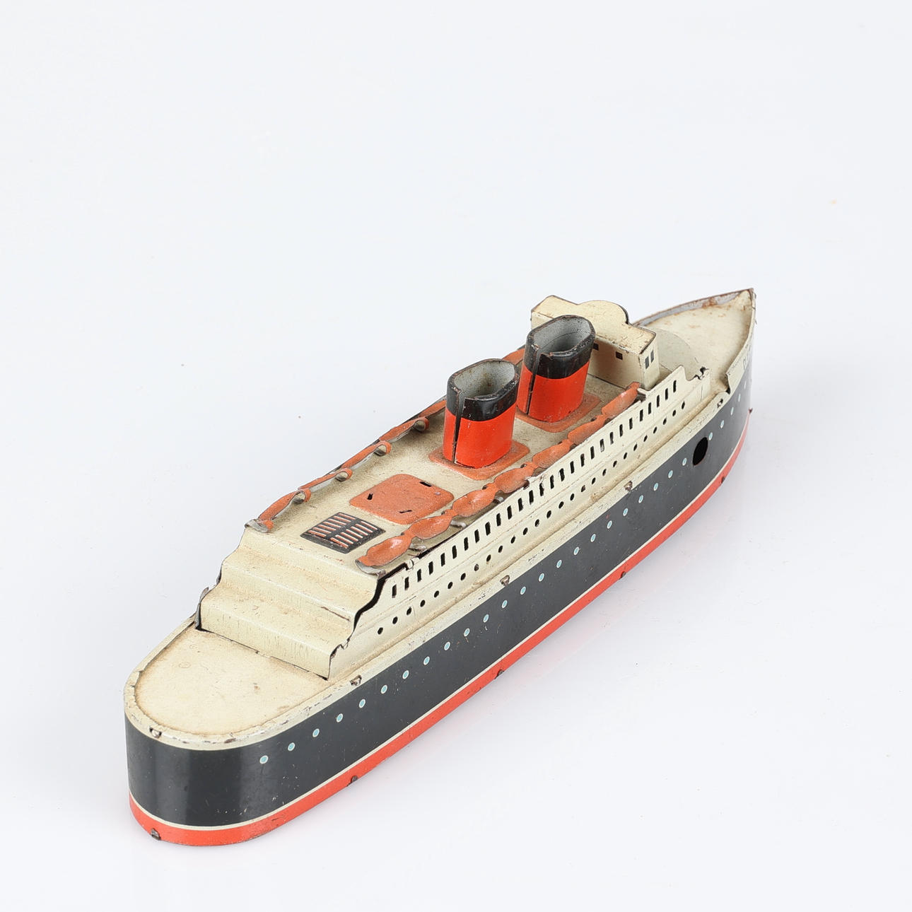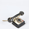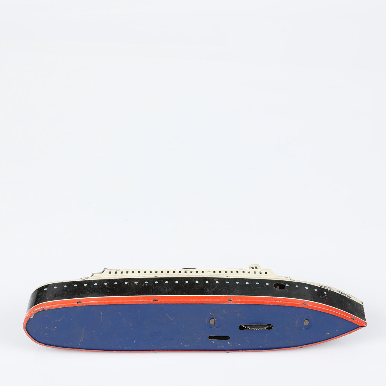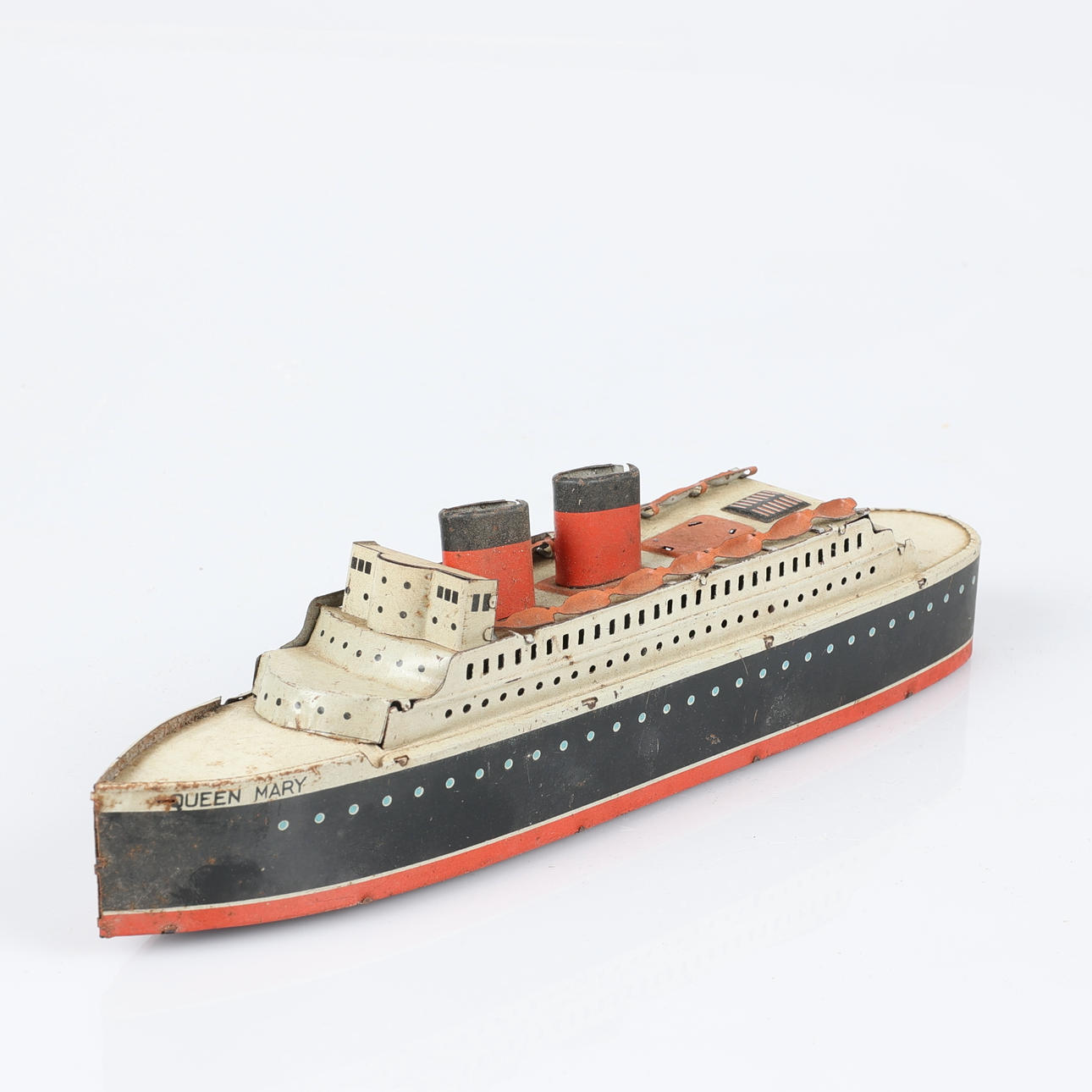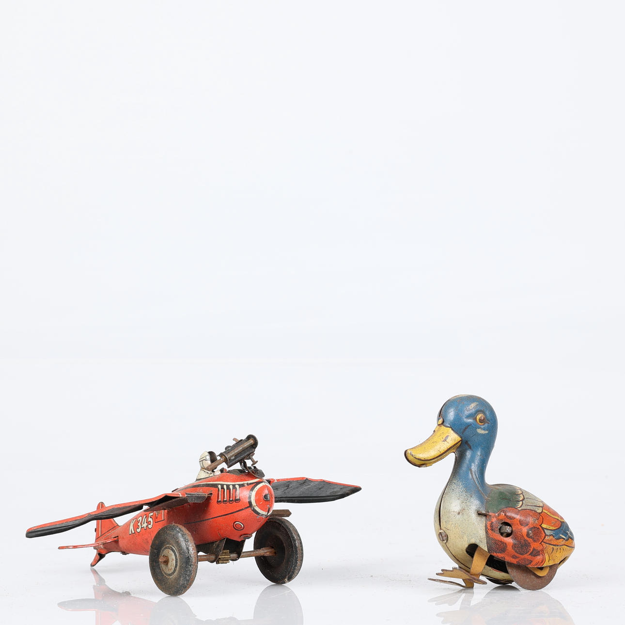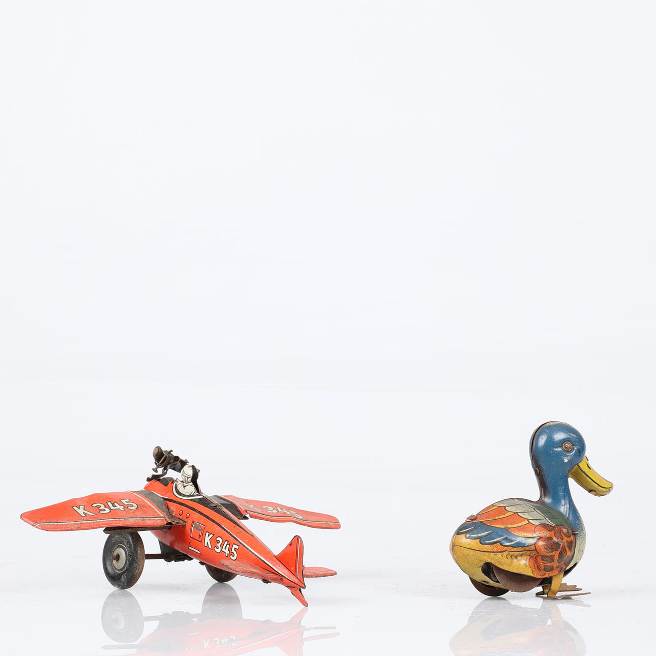 Båt, Queen Mary. Längd 25 cm. Flygplan, Foreign D.R.G.M., K345. Längd 14,5 cm. Fågel, Foreign D.R.G.M. Höjd 7,5 cm. Telefon, höjd ca 8 cm.