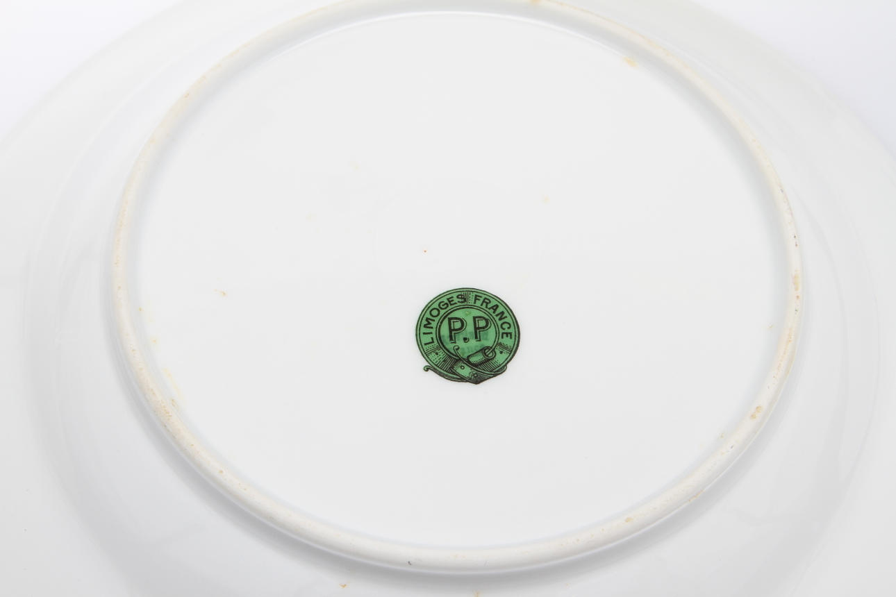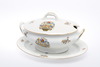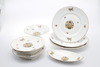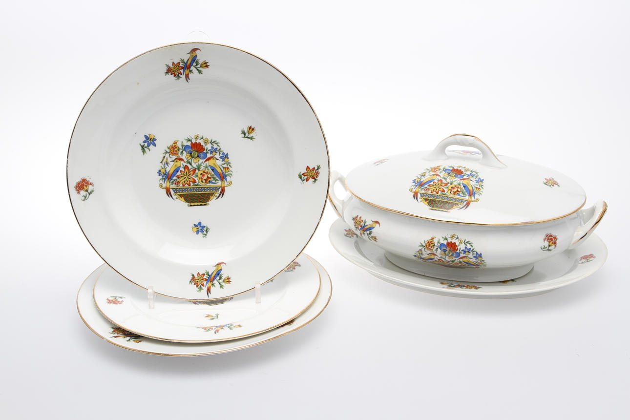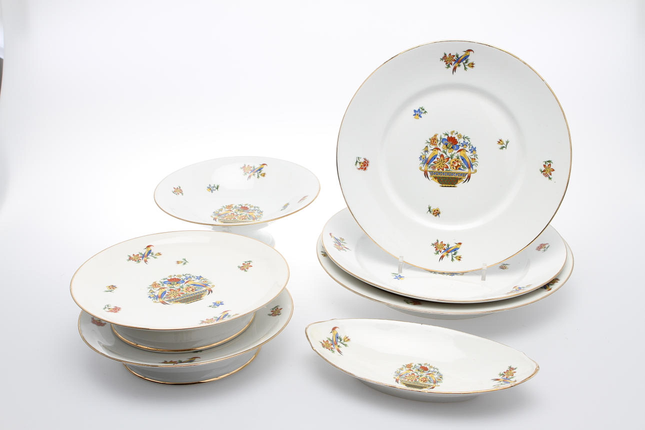 Dekor av blommor o fåglar. Best av 2 terriner med underfat, 34 stora tallrikar, 10 mindre, 11 djupa samt 7 uppläggningsfat o skålar.