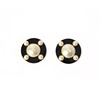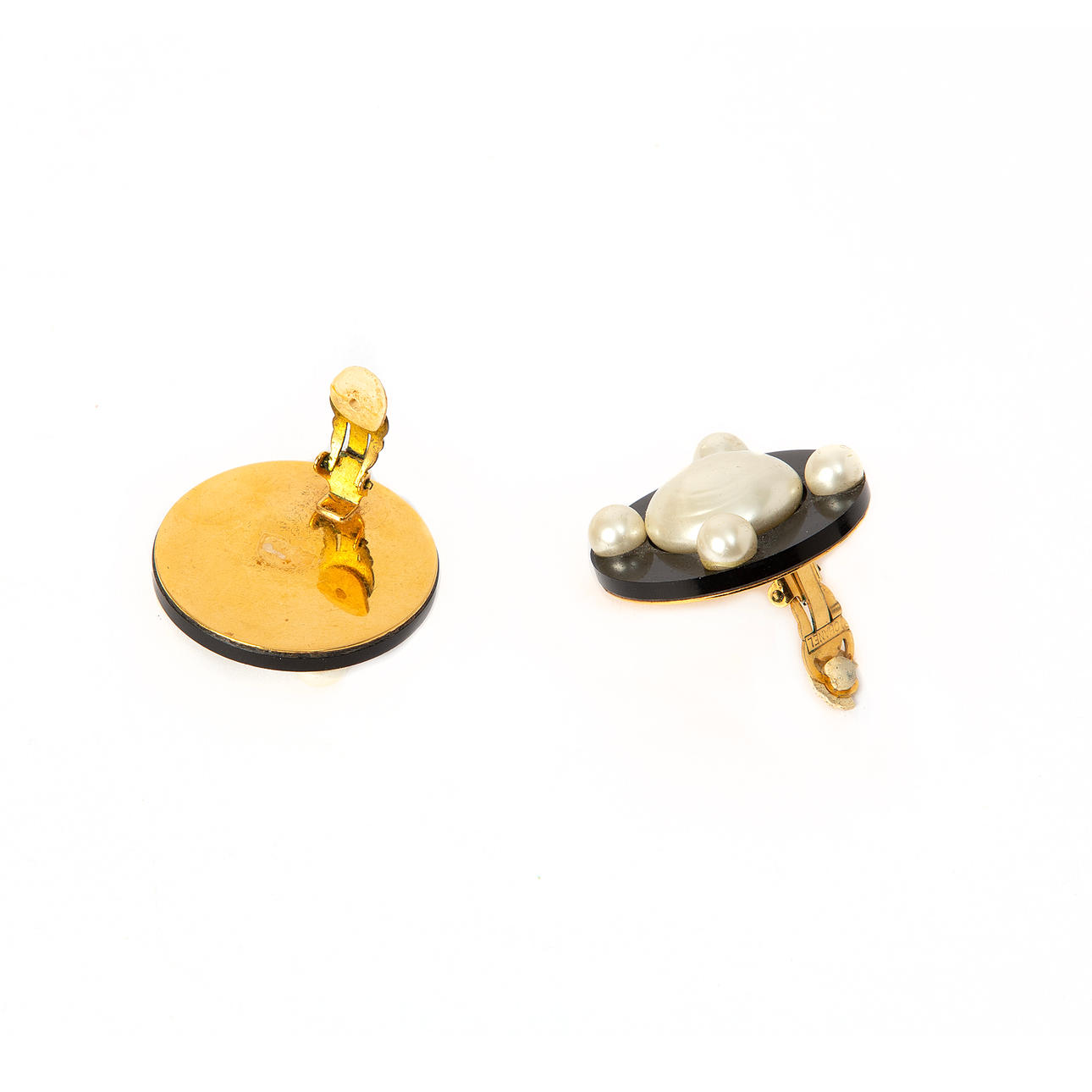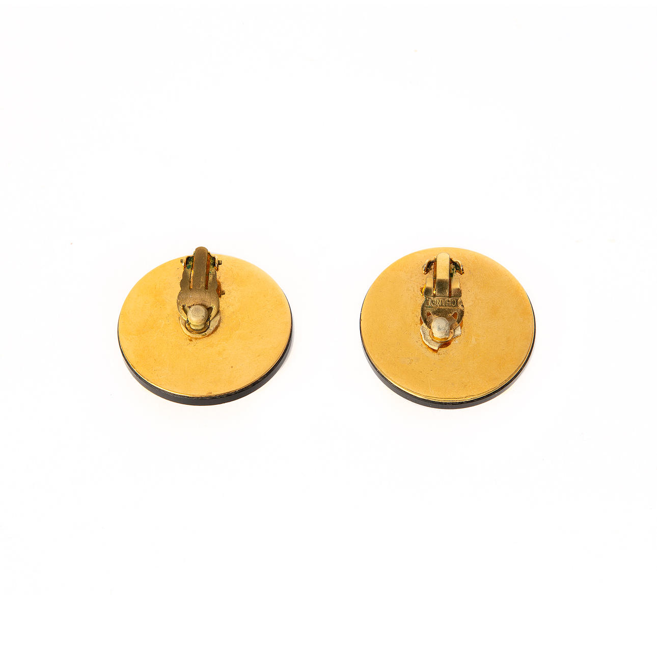 Clips. Bakstycke i gulmetall. Märkta "CHANEL". Diameter ca 4 cm. Sammetsetui från Harrods medföljer.
