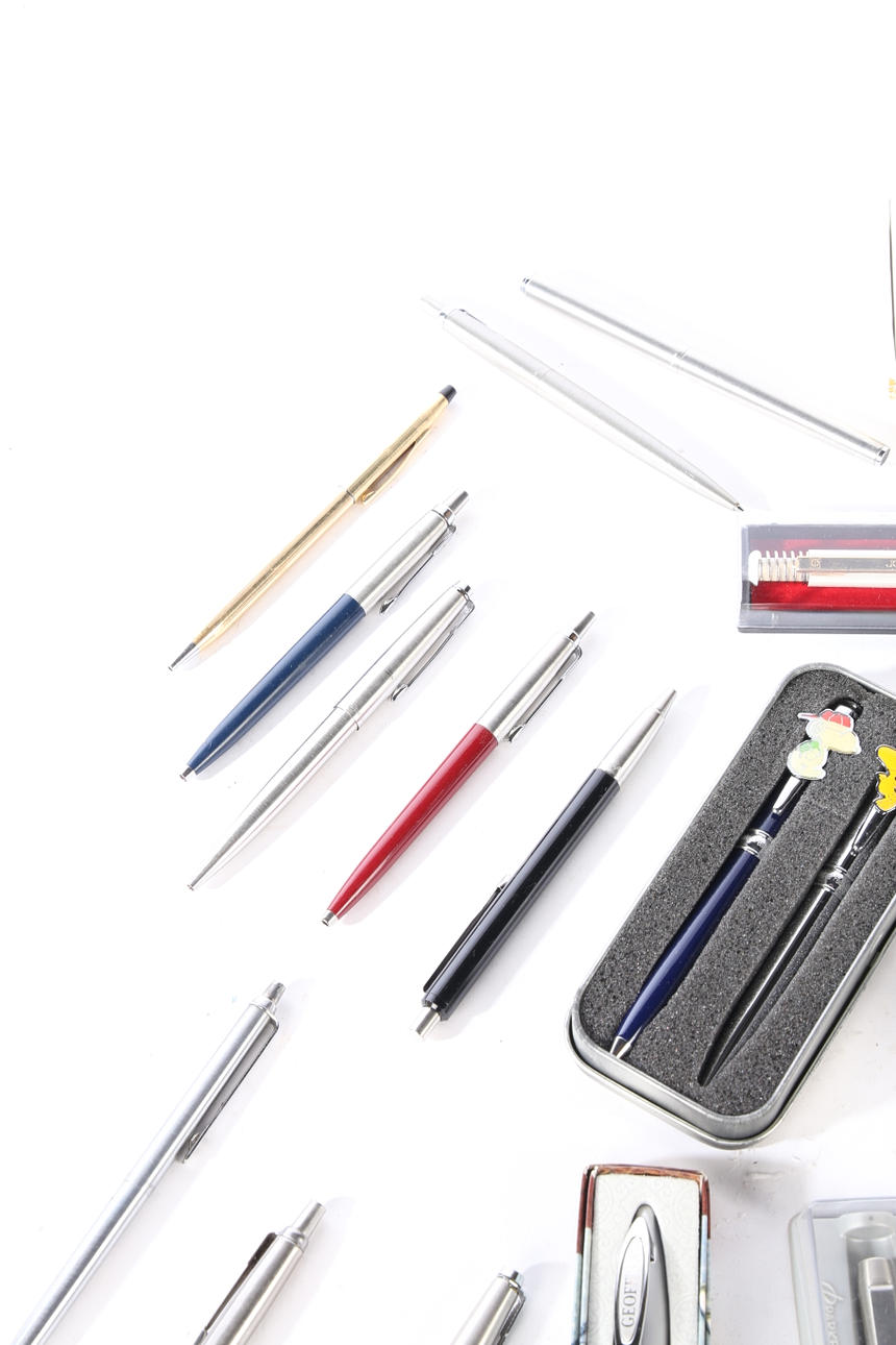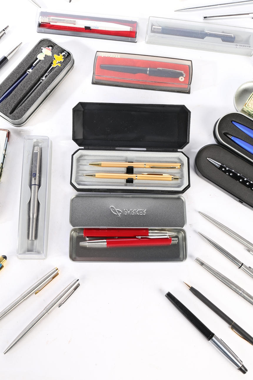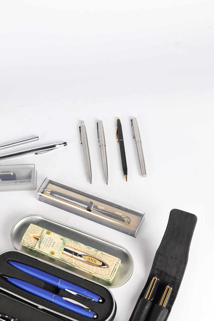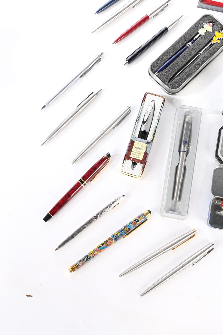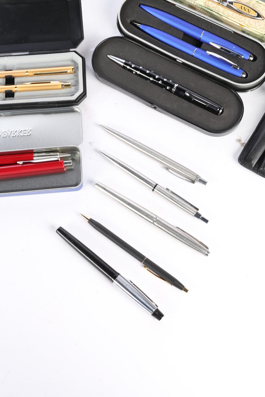 Att inkludera en Watermans kulspets med röd marmoreffektkropp, många Parker-pennor etc. (antal).