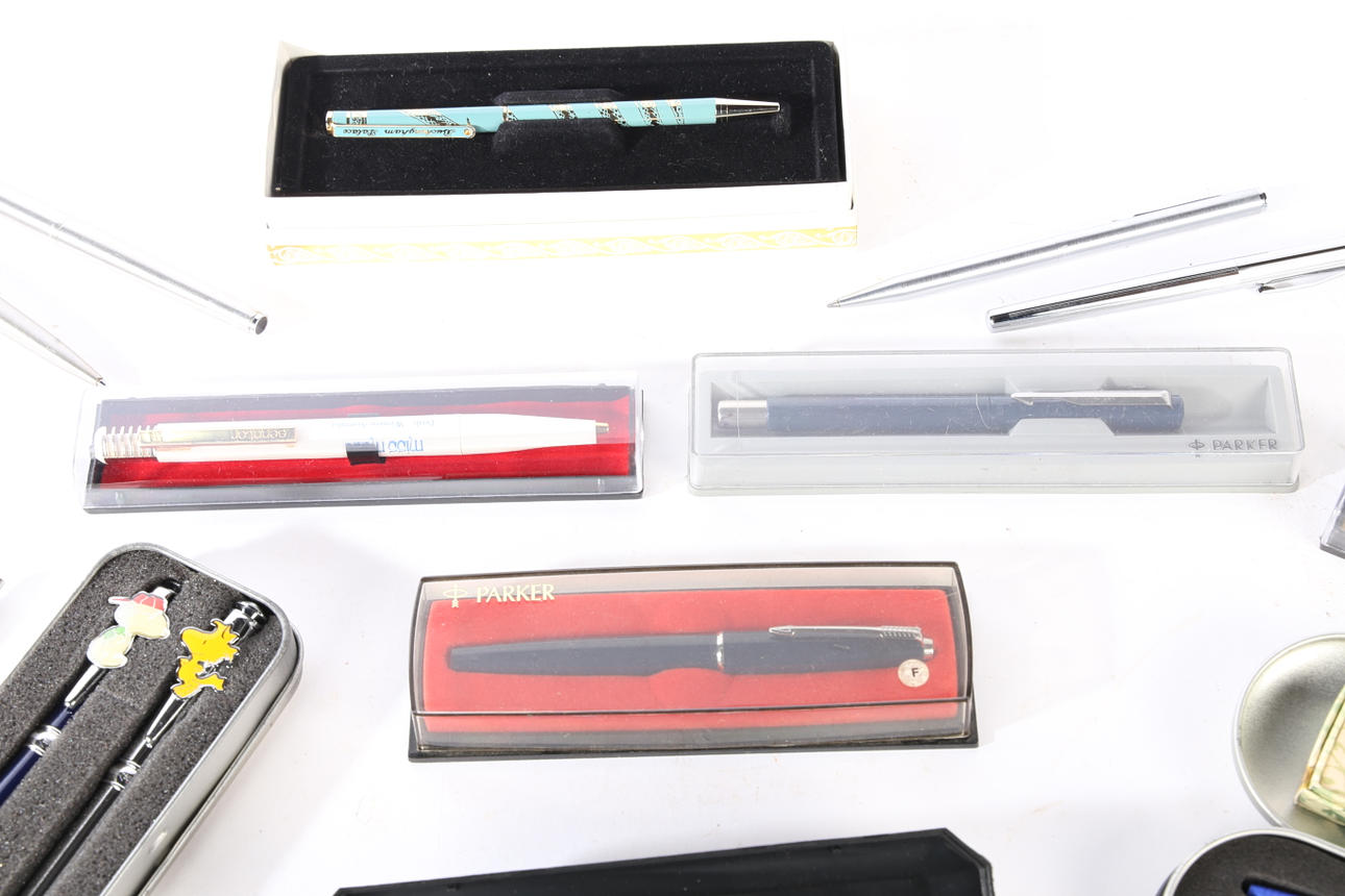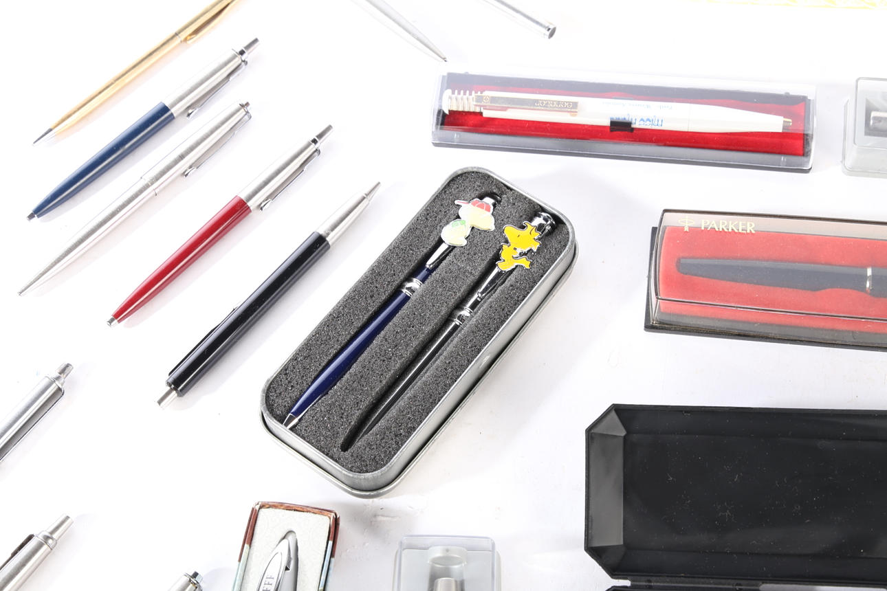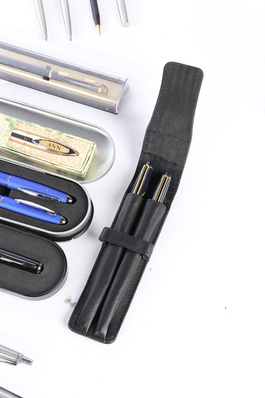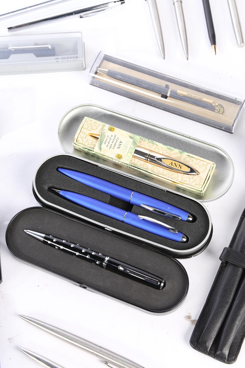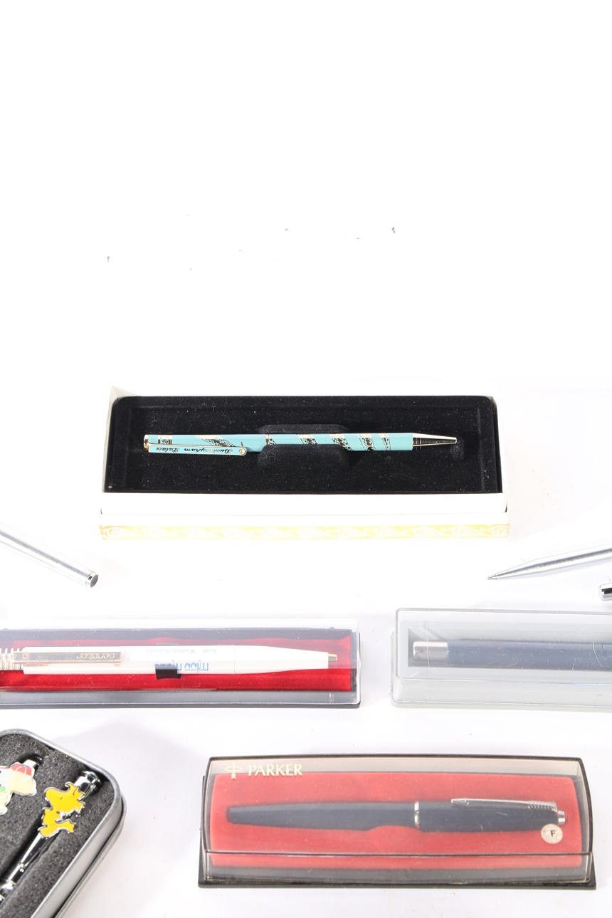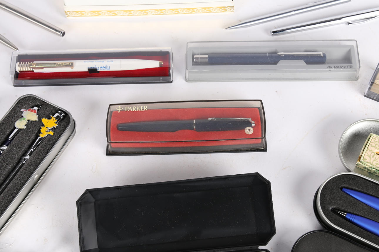 Att inkludera en Watermans kulspets med röd marmoreffektkropp, många Parker-pennor etc. (antal).
