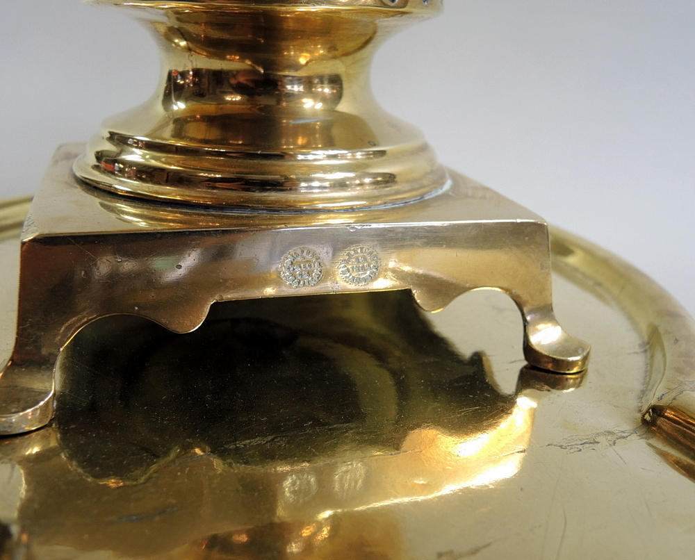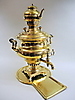 Rysk samovar med bricka och kanna, mässing, förtennad insida, stämpel: w Tul Aleksan. Pokrovsk., bucklor och repor samt små Tårar i sömmarna, Tula, troligen omkring 1850/70, H totalt. cca 52cm.