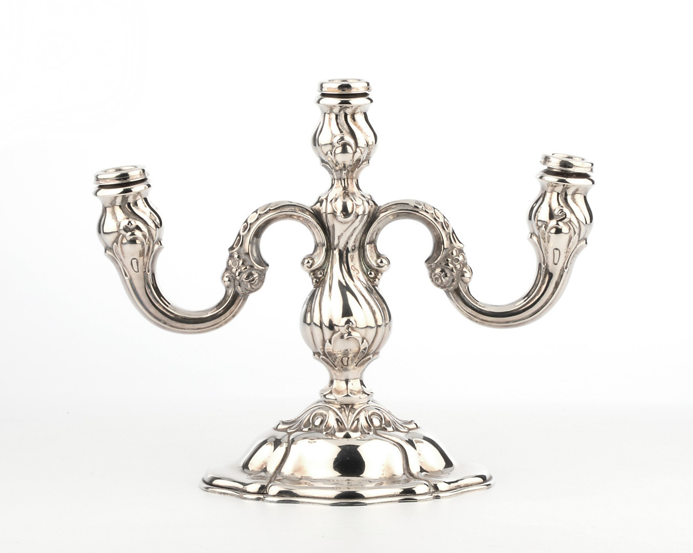 337069. 3-FLAMMIGER LEUCHTER, SILBER 925. Böjda armar med blommiga element, tyska.