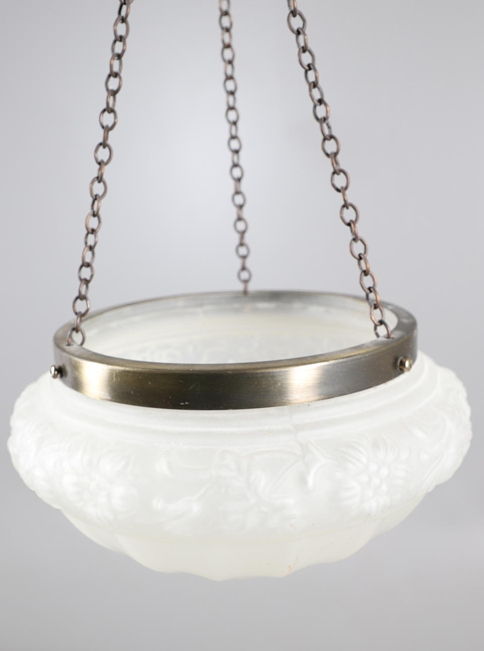 den frostat glasskärmen med gjutna blad och räfflad dekoration, med borstad metallfästen, ca 27 cm max diameter.