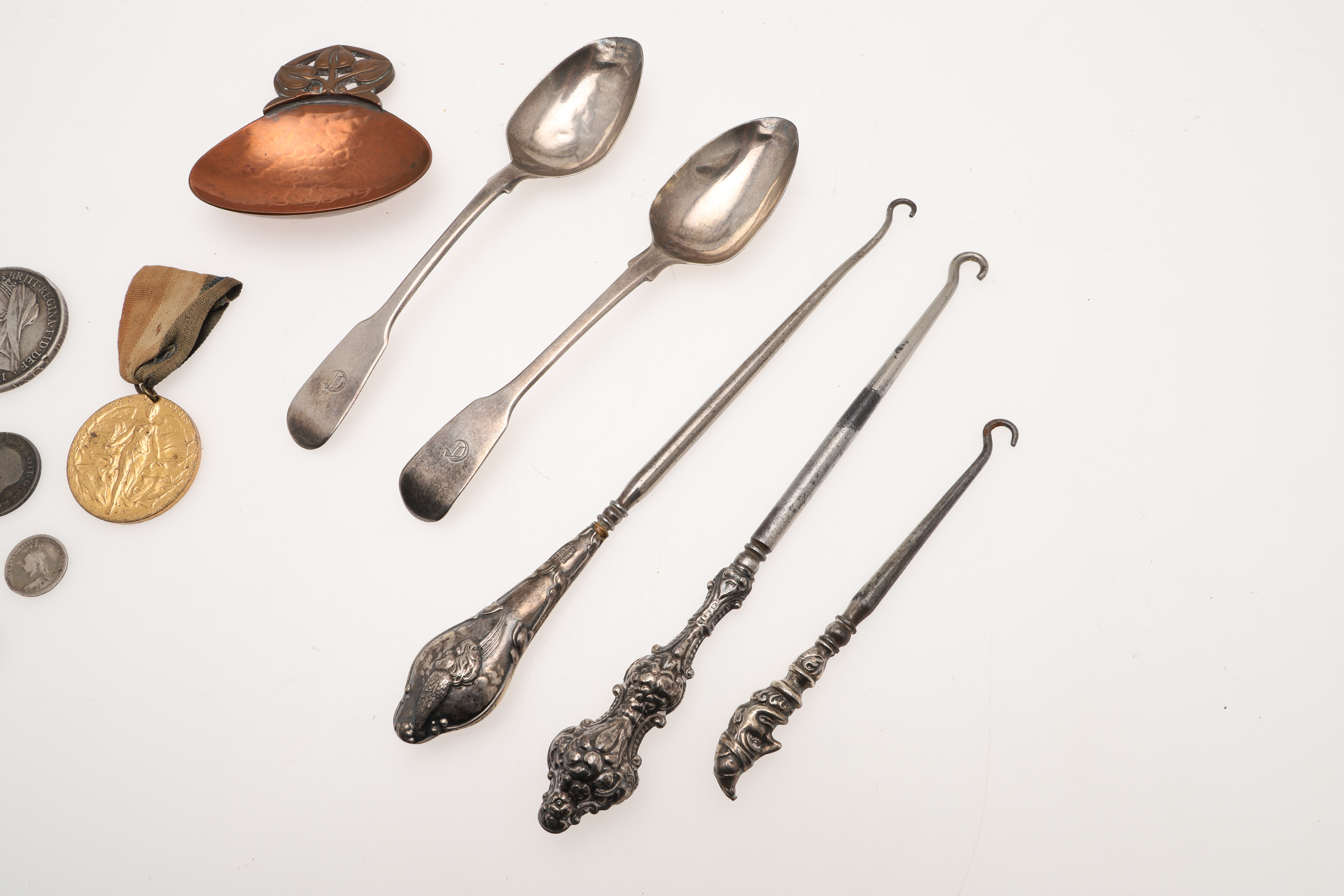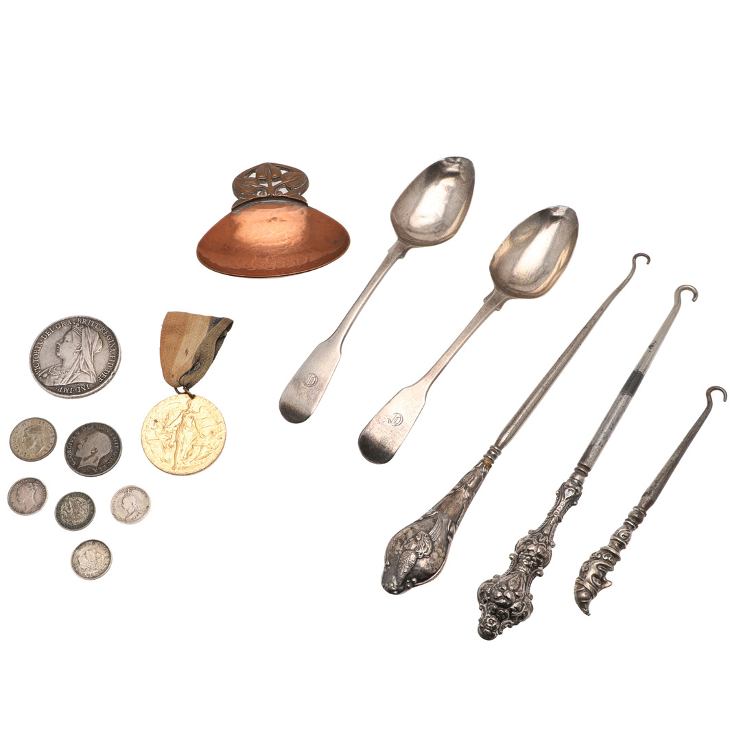 3372484. VIKTORIANSK SILVERKRONA, SILVERKNAPPKROKAR INKLUSIVE MR PUNCH & ANDRA FÖREMÅL.