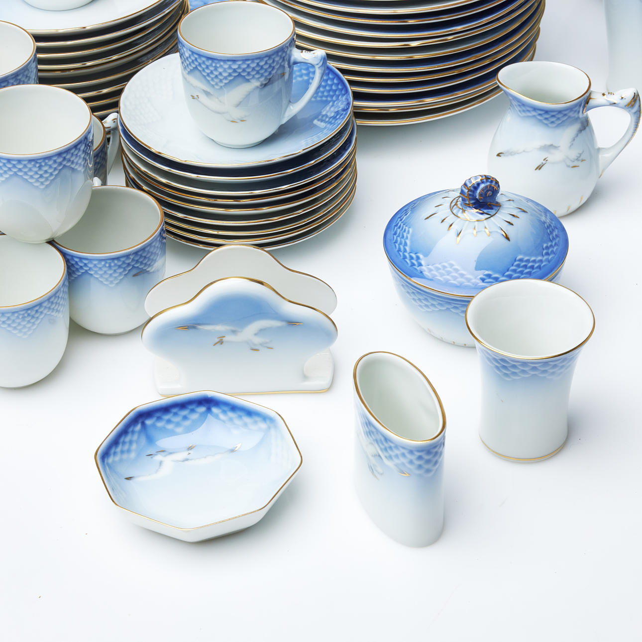 1 kaffekanna, 12 kaffekoppar med fat, 12 assietter, 8 moccakoppar med fat, 8 assietter, 1 sockerskål, 1 liten vas, 1 stor vas, 1 triangulärt serveringsfat, 1 ställning för srvetter, 3 fåglar, 1 oktagonalt litet fat, 1 gräddkanna, 1 burk för tandpetare.
