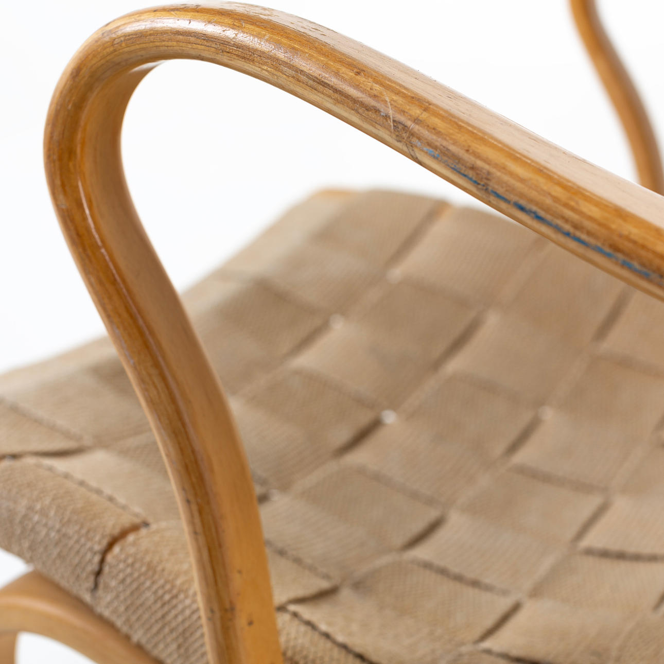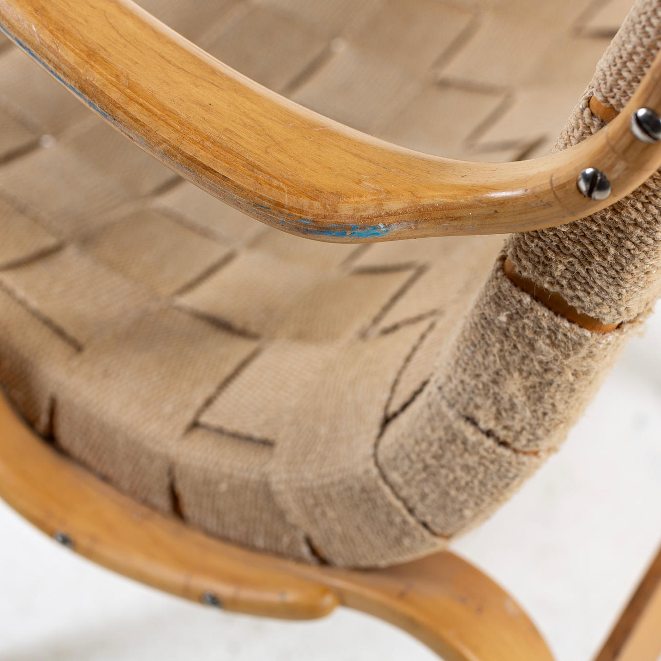 Avslag på ben baktill finns, sadeljord fransig på baksidan vid fästning, mindre prick / märke på sadeljord finns. bruksslitage på armstöd och stomme enligt bild.