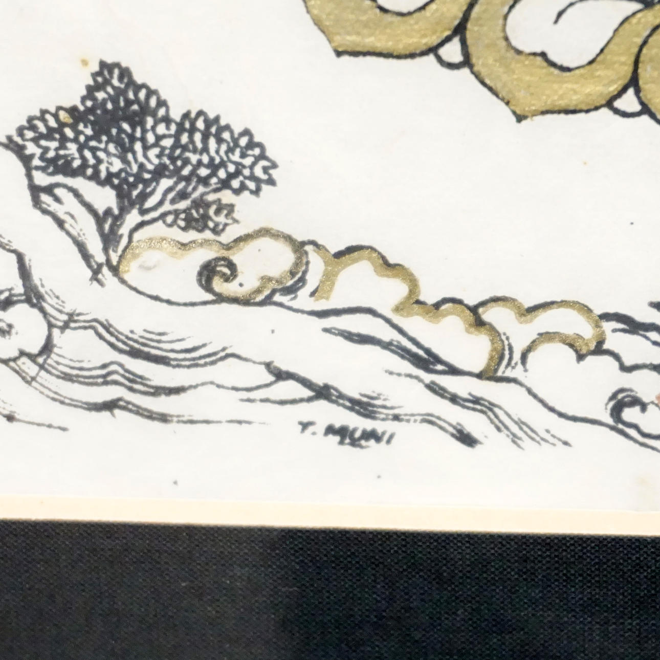 Träsnitt på pergamentpapper delvis upphöjda med guld. Bladstorlek 28 x 22 cm. Ramstorlek 40 x 33,5 cm.