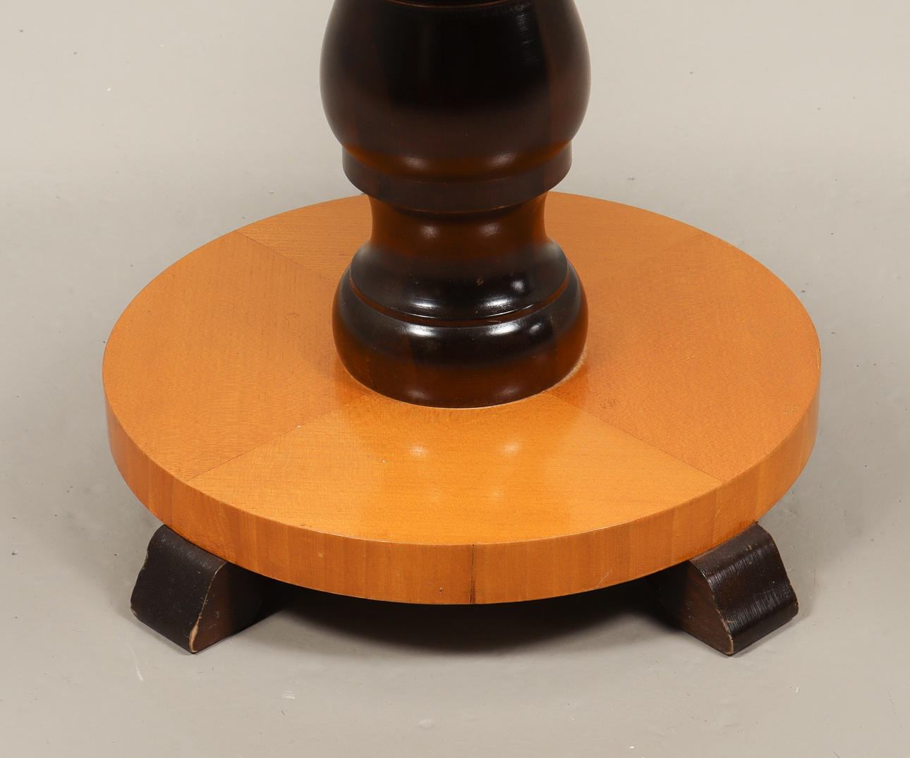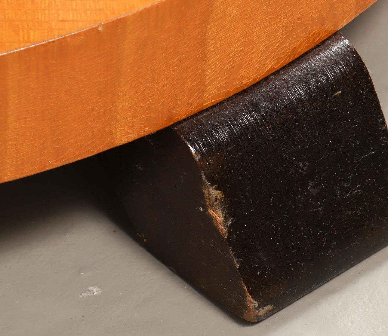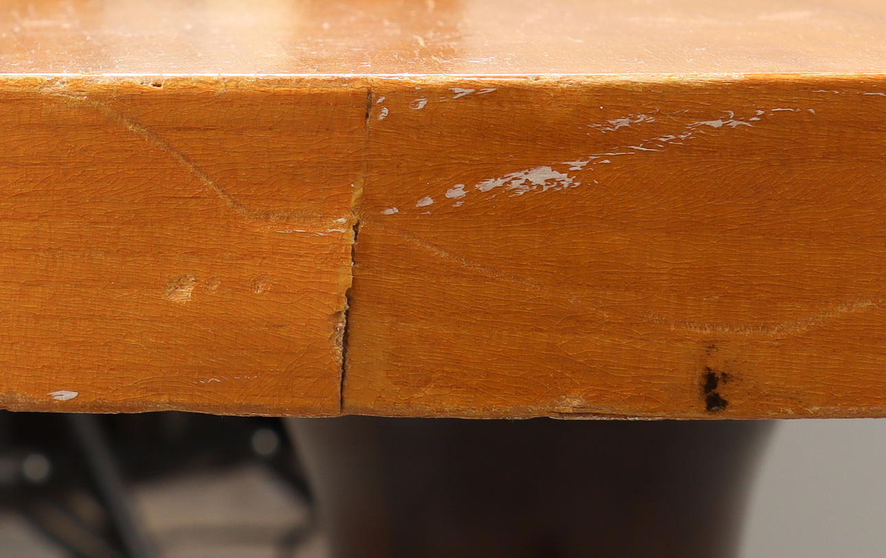 Bruksslitage, något mindre fanérbortfall, sargens kant med spricka/släppt fanér.
