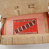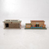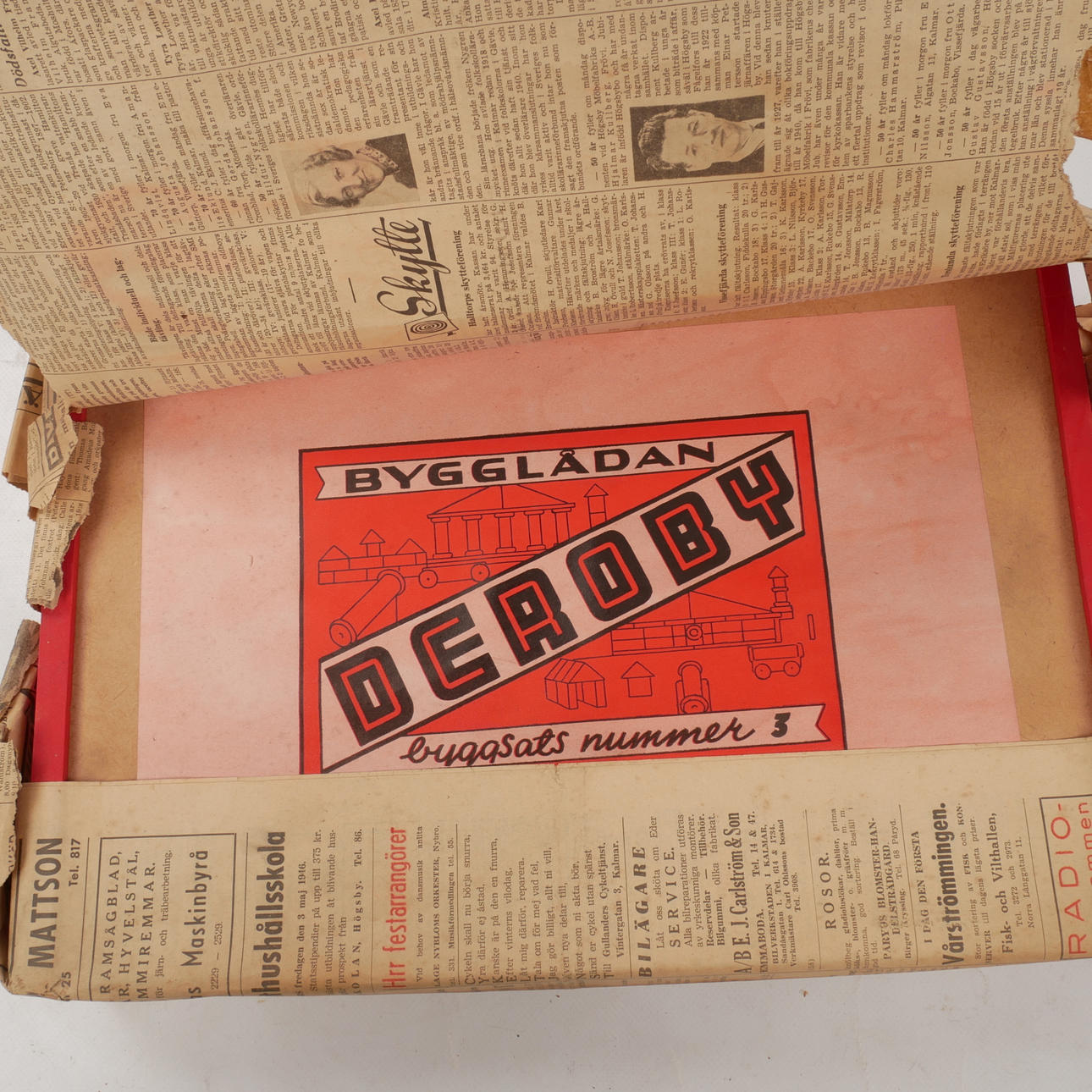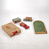Byggbil längd 28 cm. Järnvägsstation möjligen Kährs. Fortunaspel, garage "Micki". Träklosslåda Elverssons Påryd inslagen i tidning från 1946.