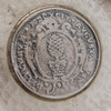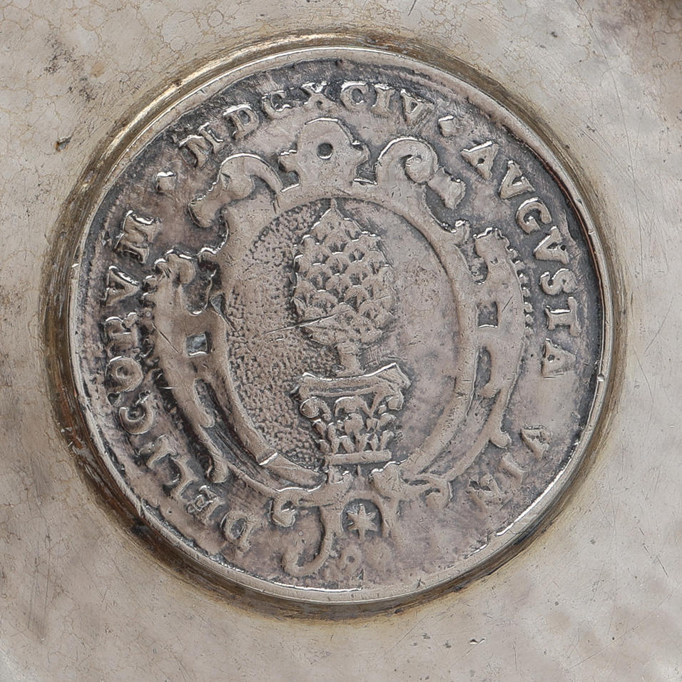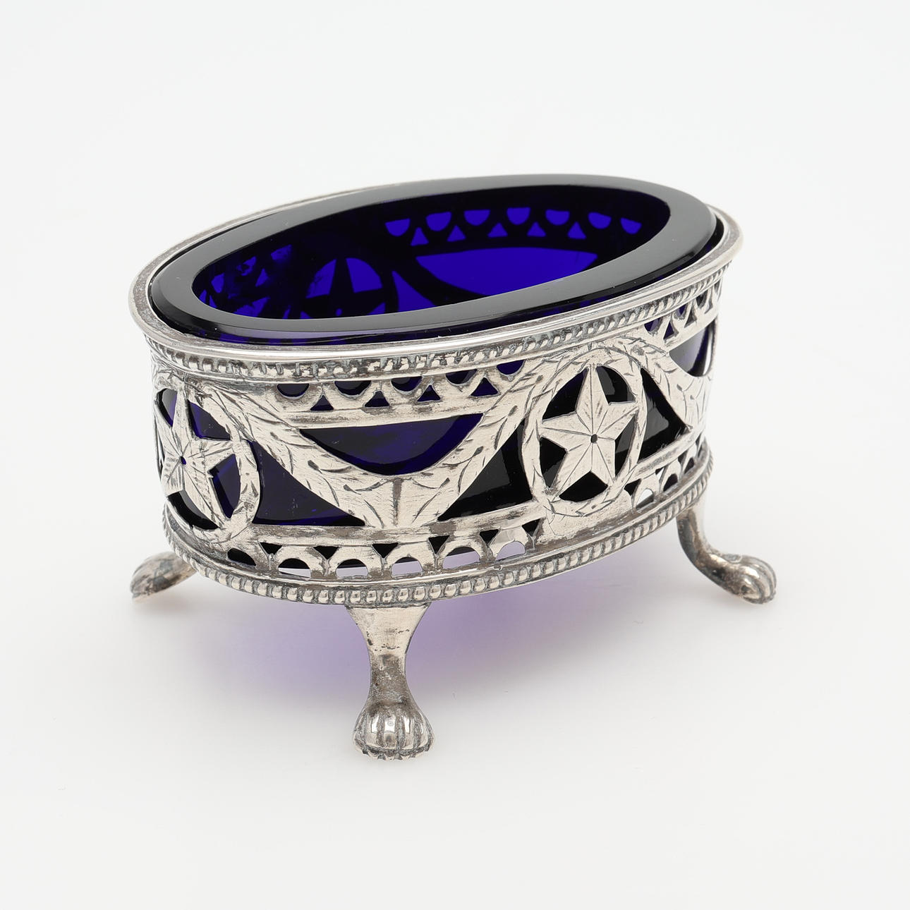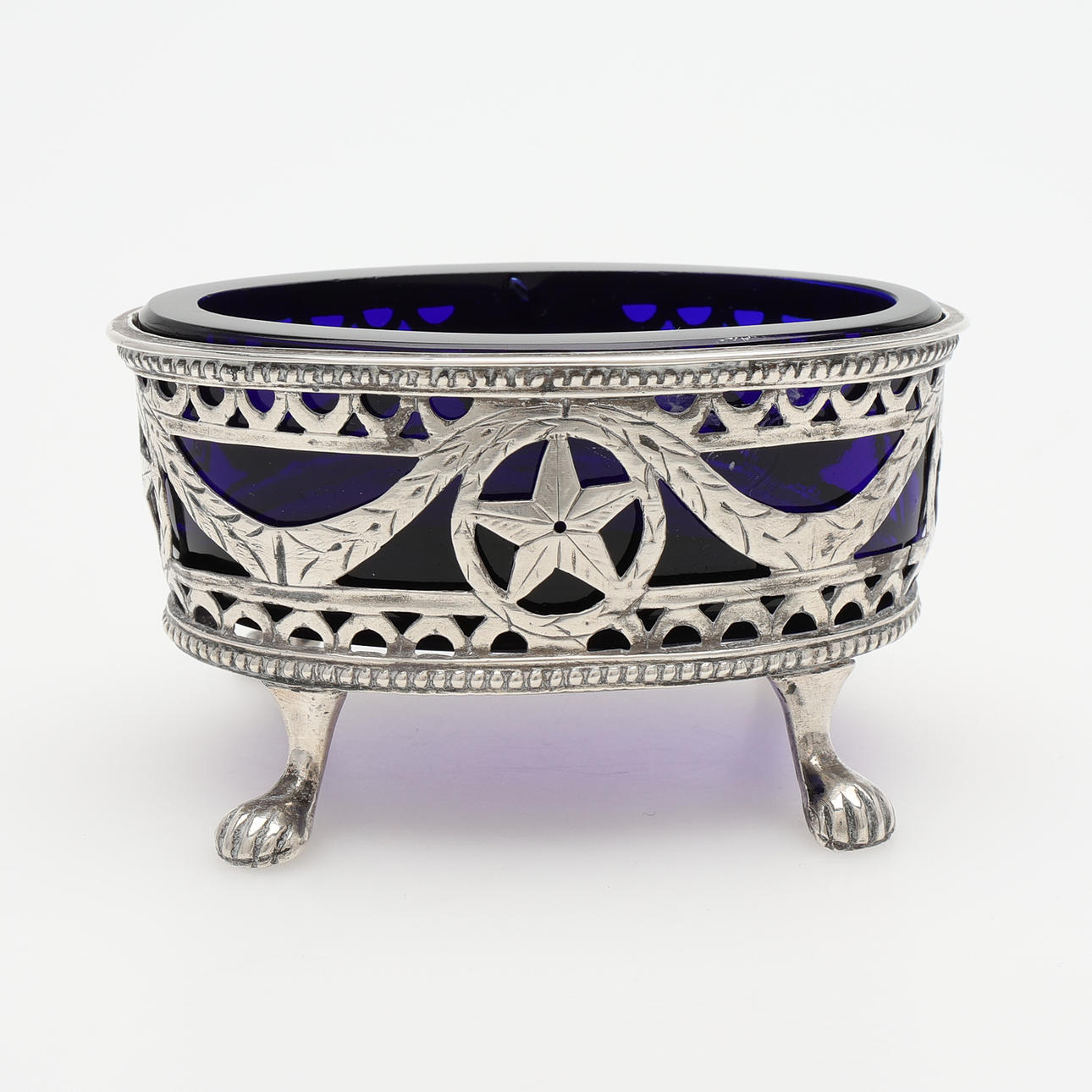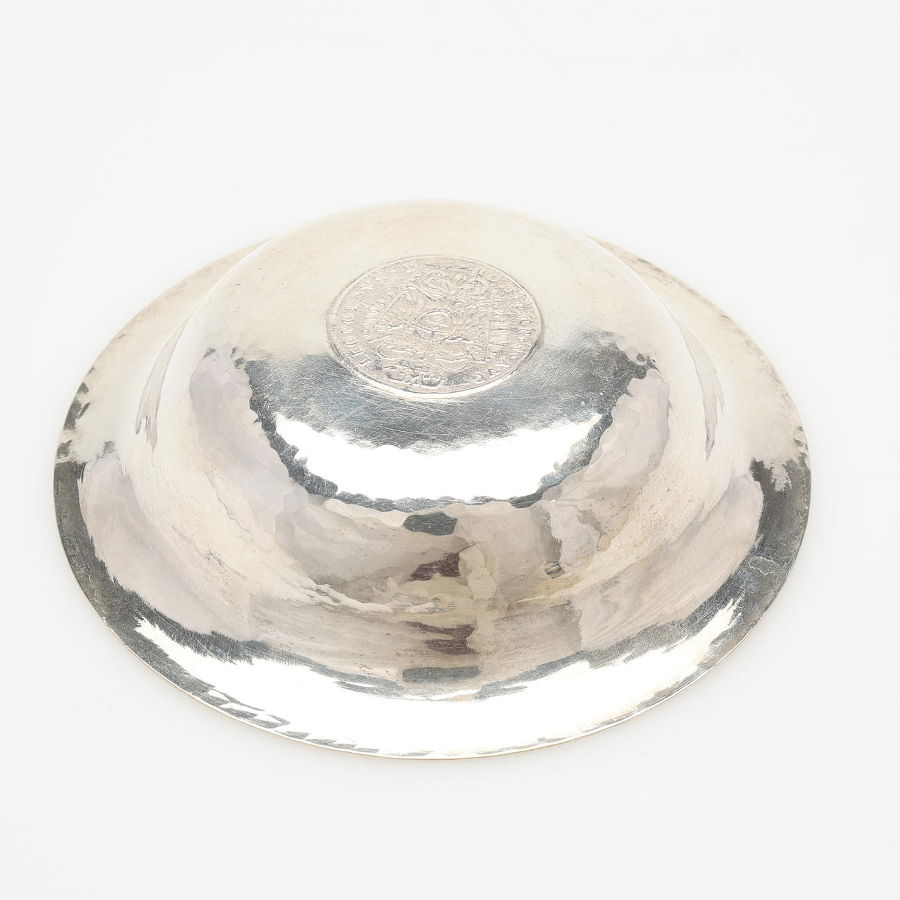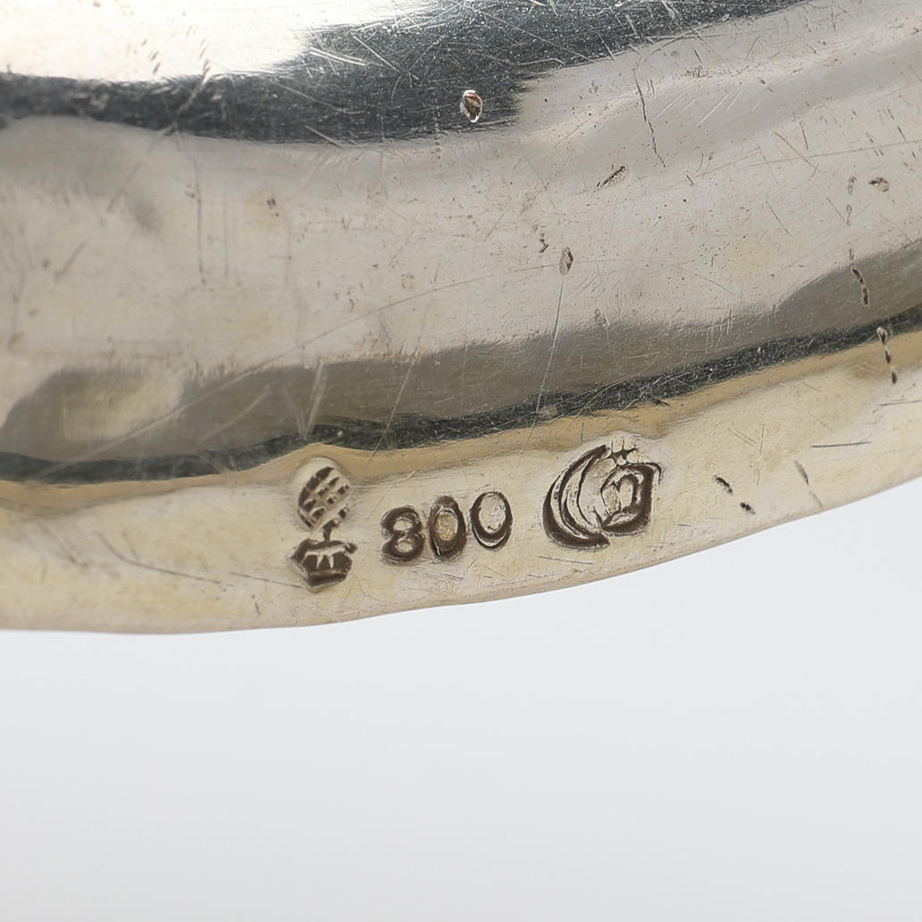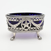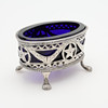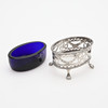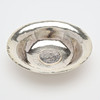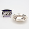 Silver: skål med infällt mynt, Tyskland, diameter 11 cm samt saltkar med insats av blått glas, längd 8,5 cm, total vikt exklusive glas 128 gram.