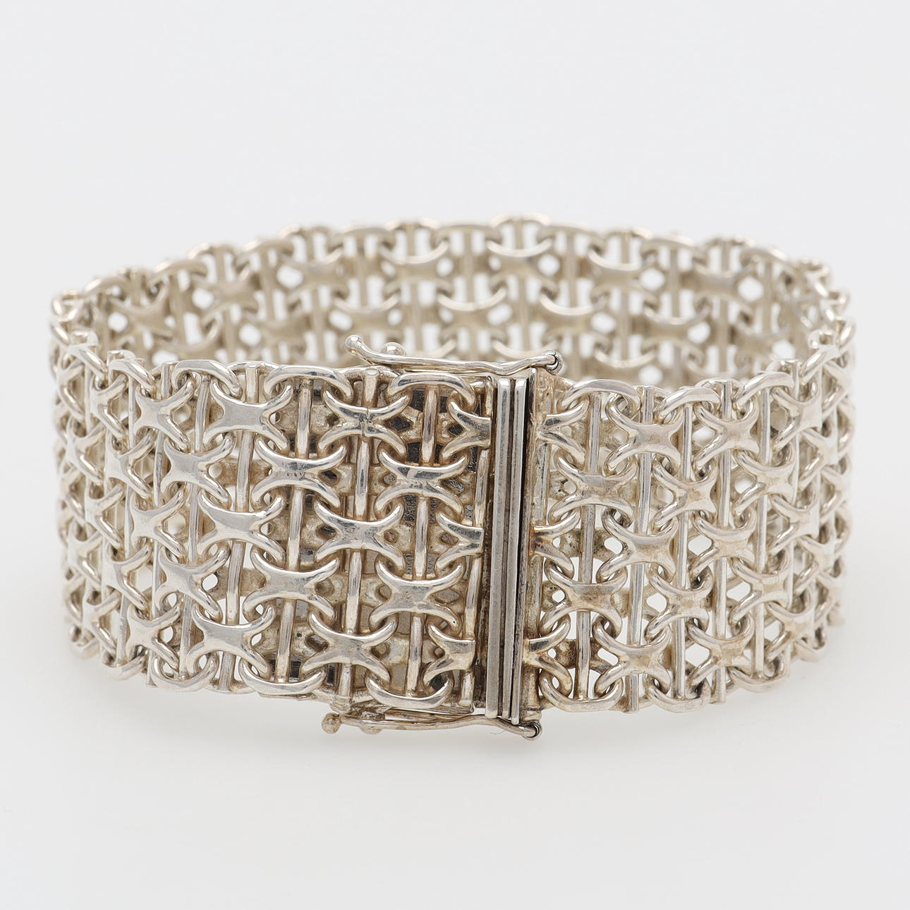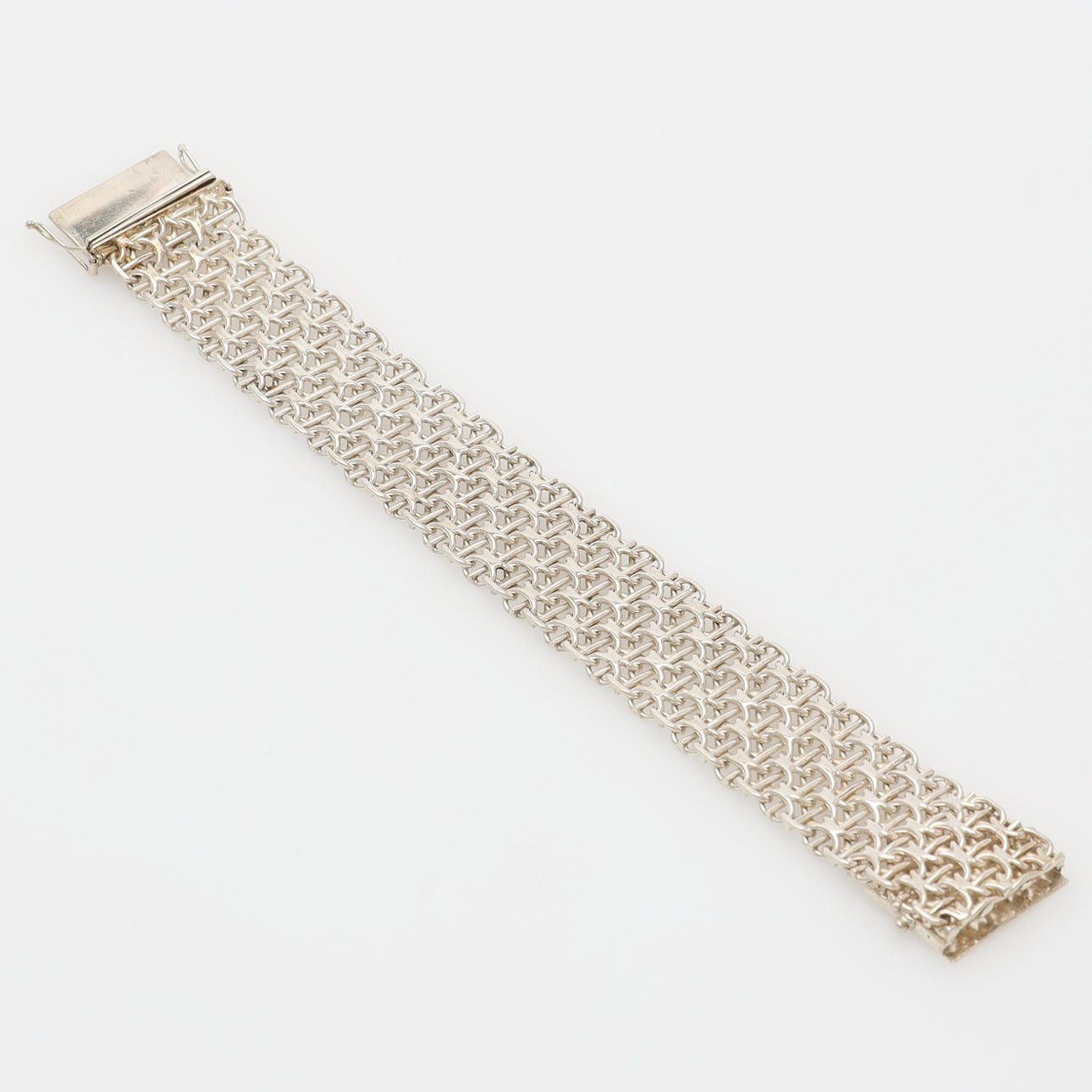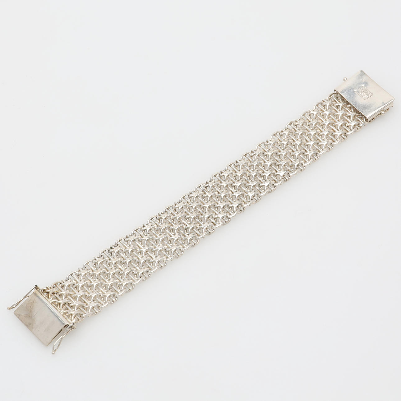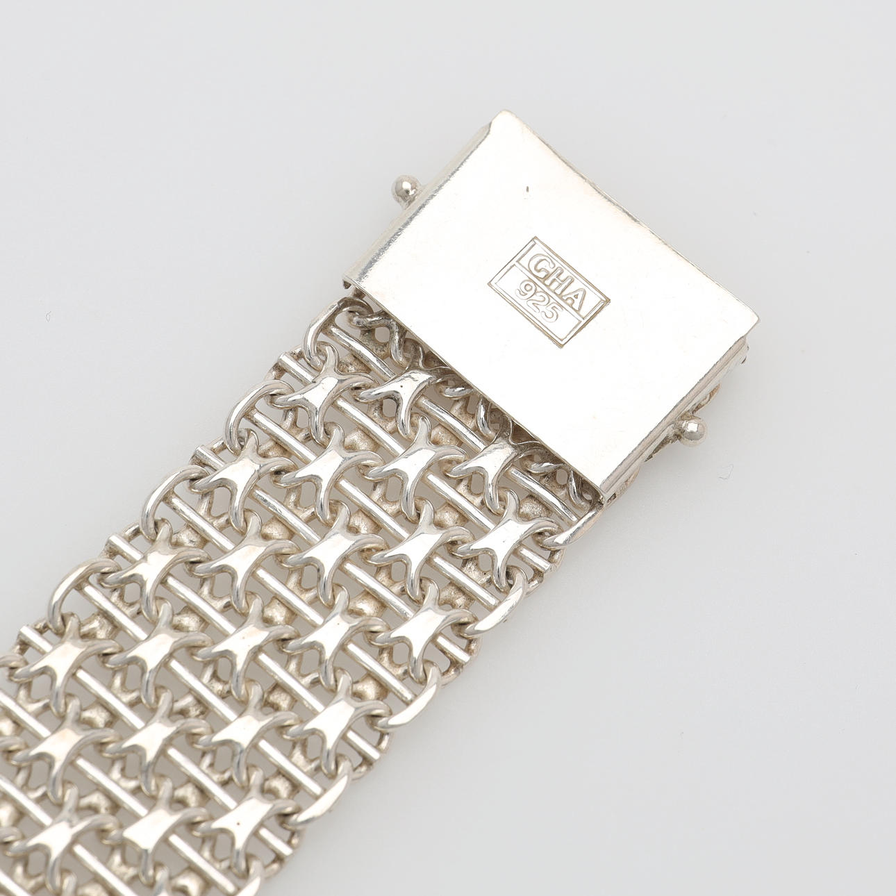 Armband med dubbla lås, märkt GHA 925. Längd 19,5 cm (exkl låsdel), bredd 2,2 cm. Vikt 49,6 gram.