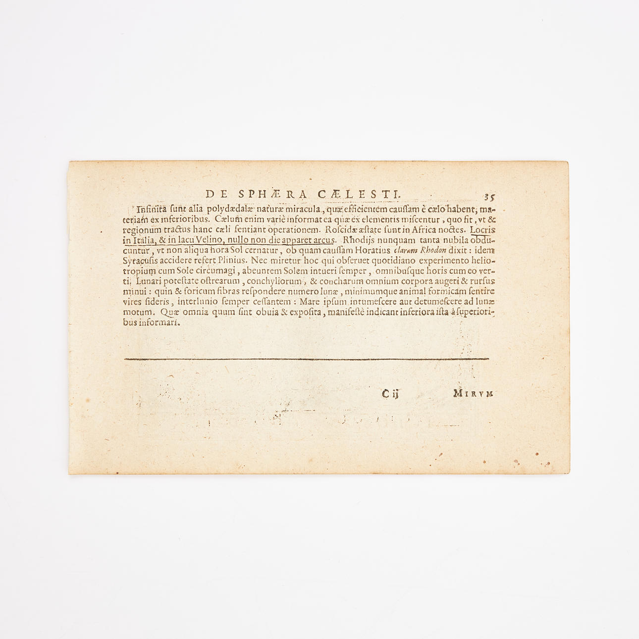 Engraved miniature map, ca 95x135 mm. Latin text on verso. Page number 36 in the upper corner. Title above: De Globo Terrae.