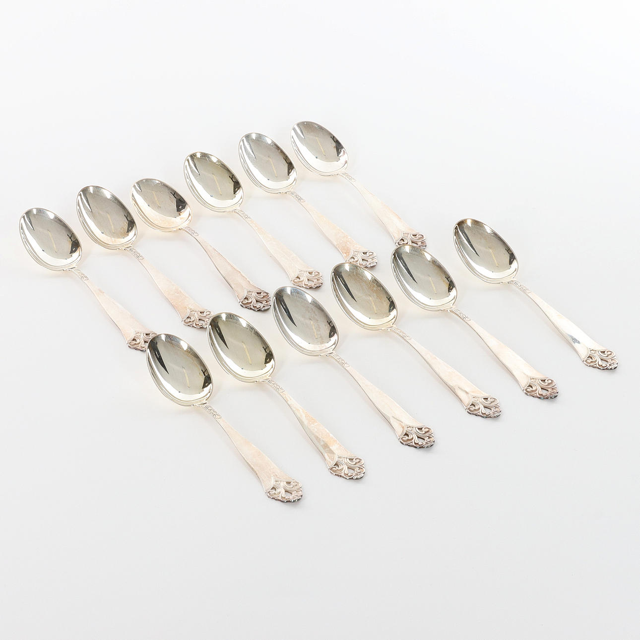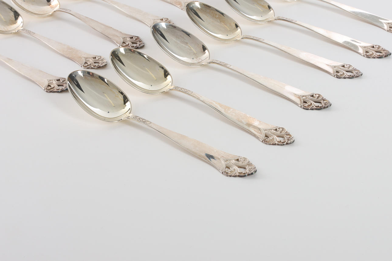 12 st dessertskedar, silver, i schatull. Stämplade NM 830 S, kattfot Längd 14,5 cm