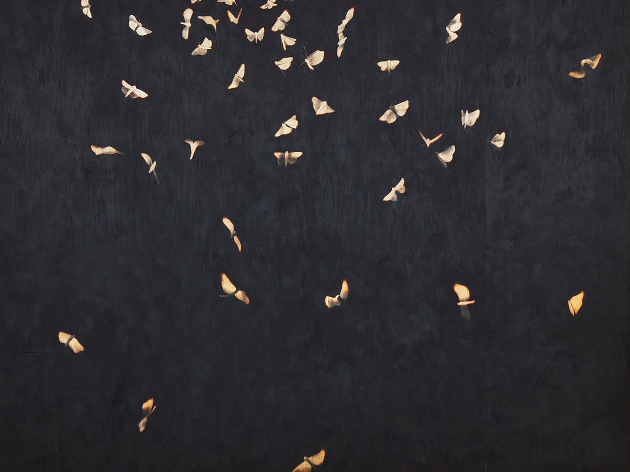 I verket Untitled (Moth/Skara) har Ylva Ceder fångat nattfjärilars flyktiga dans runt en ensam lampa. Med unik teknik fångar hon fjärilarnas lätta, snabba och lite oroliga rörelse.