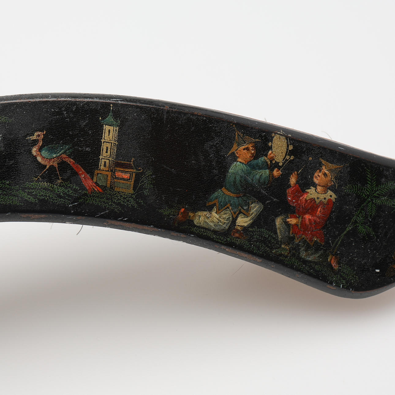 Metallplåt och trä, med kinesiserande dekor, omkring år 1900, längd 34,5 och 21,5 cm.