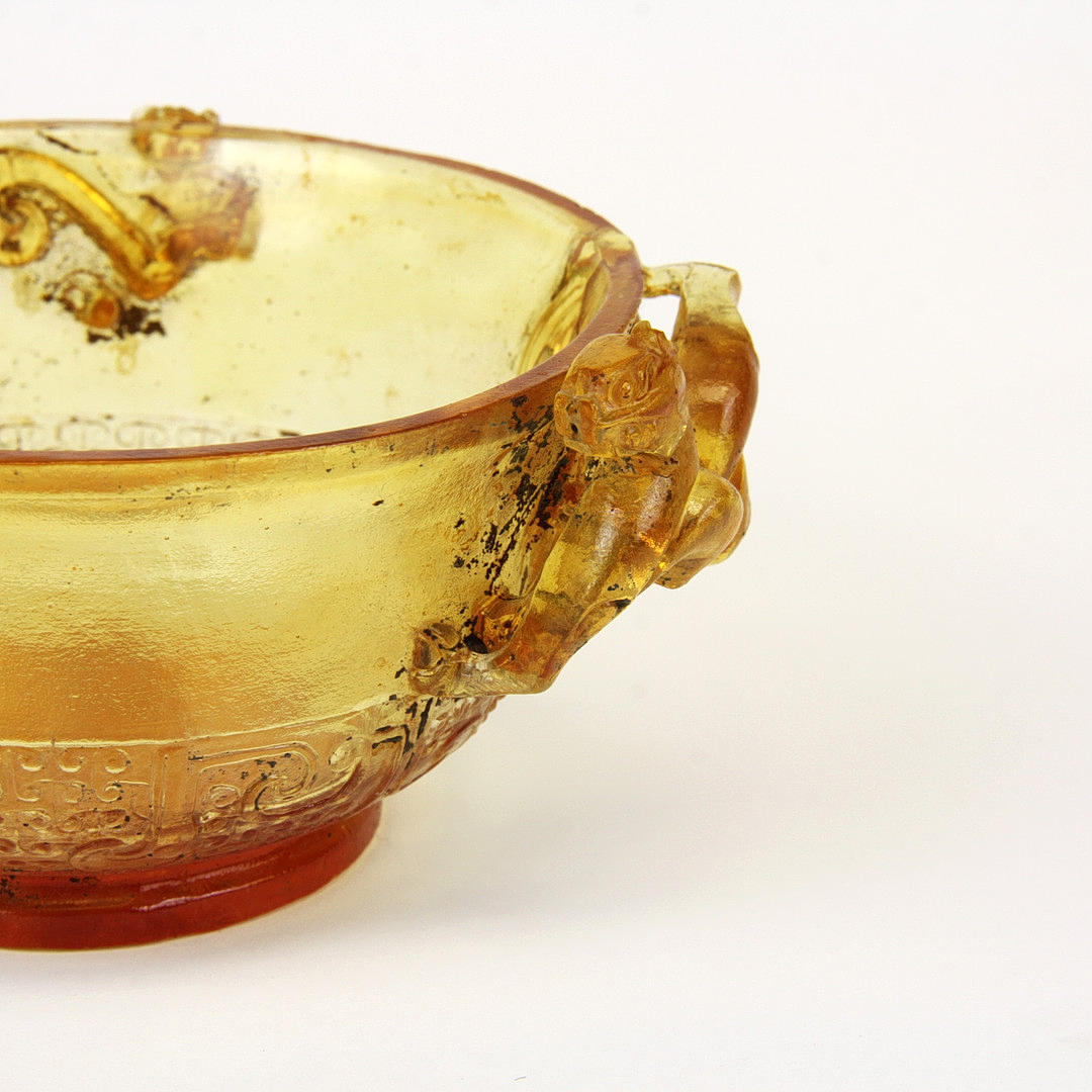 SKÅL, Pekingglas med reliefdekoration av unga drakar, Dia. 10,3 cm. H. 5,5 cm.