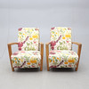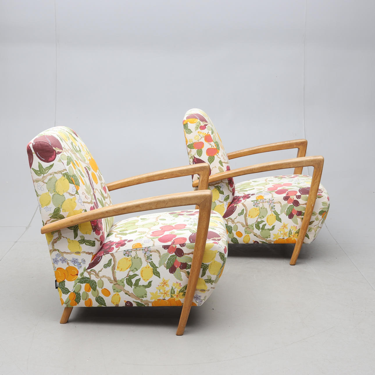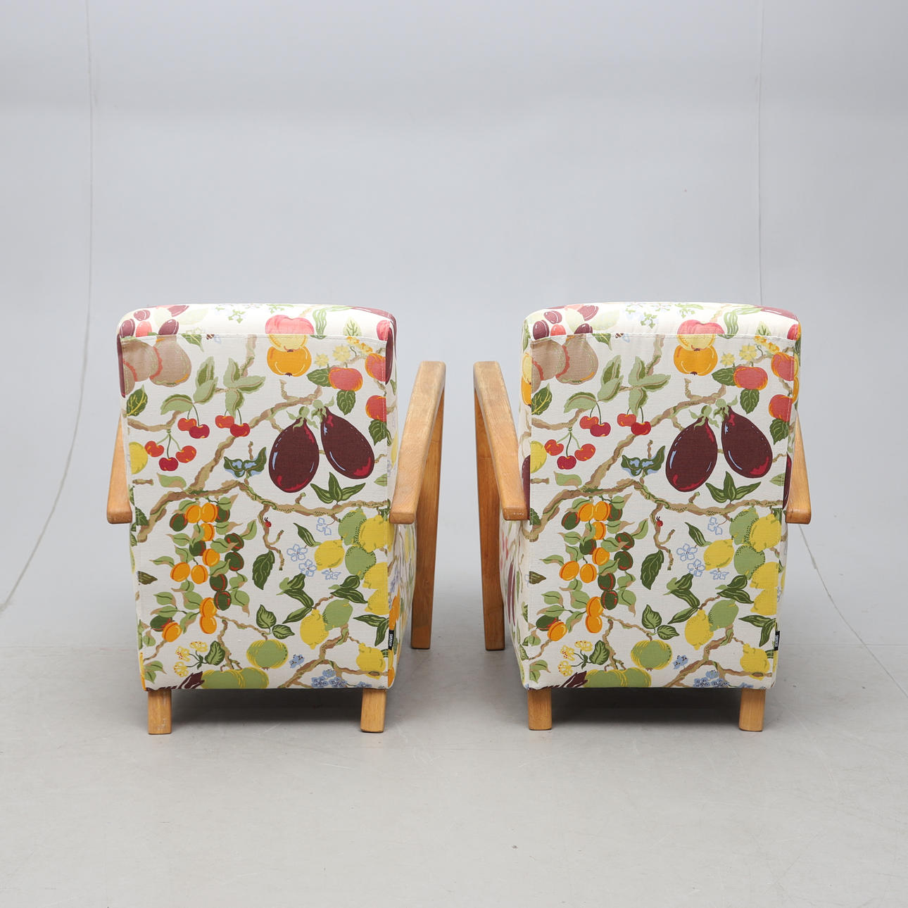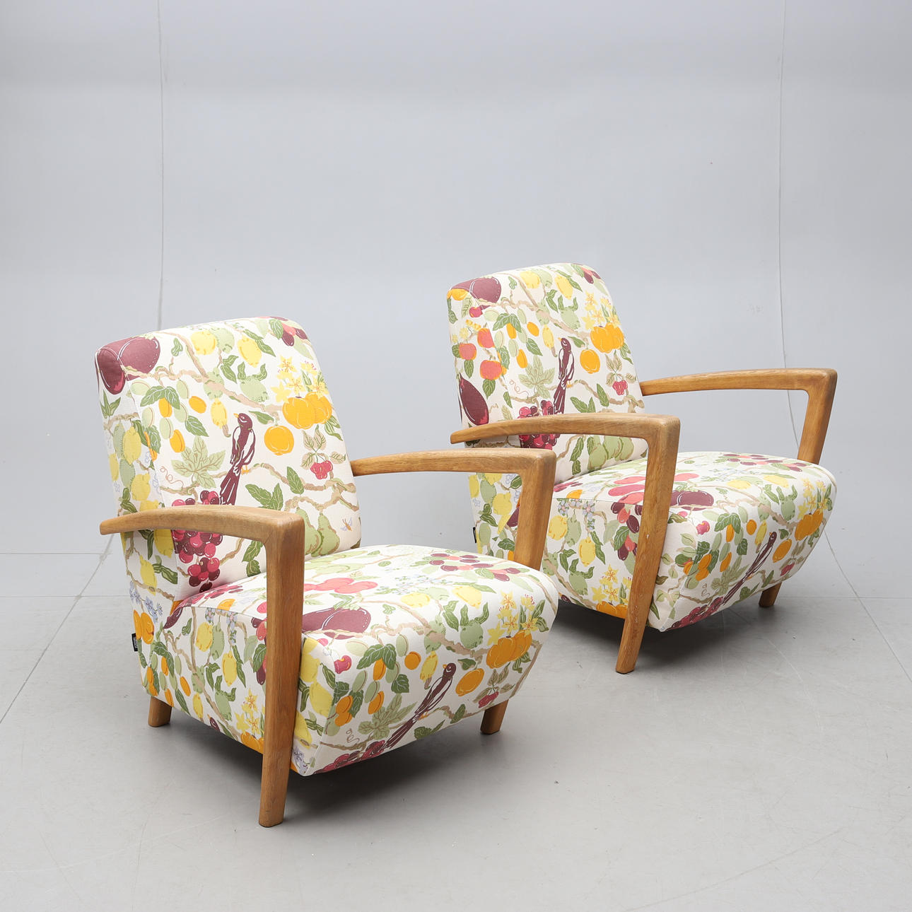 Armlän och ben i ek. Fast stoppad rygg och sits klädd med textil från Jobs. Höjd ca 81 cm.
