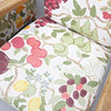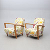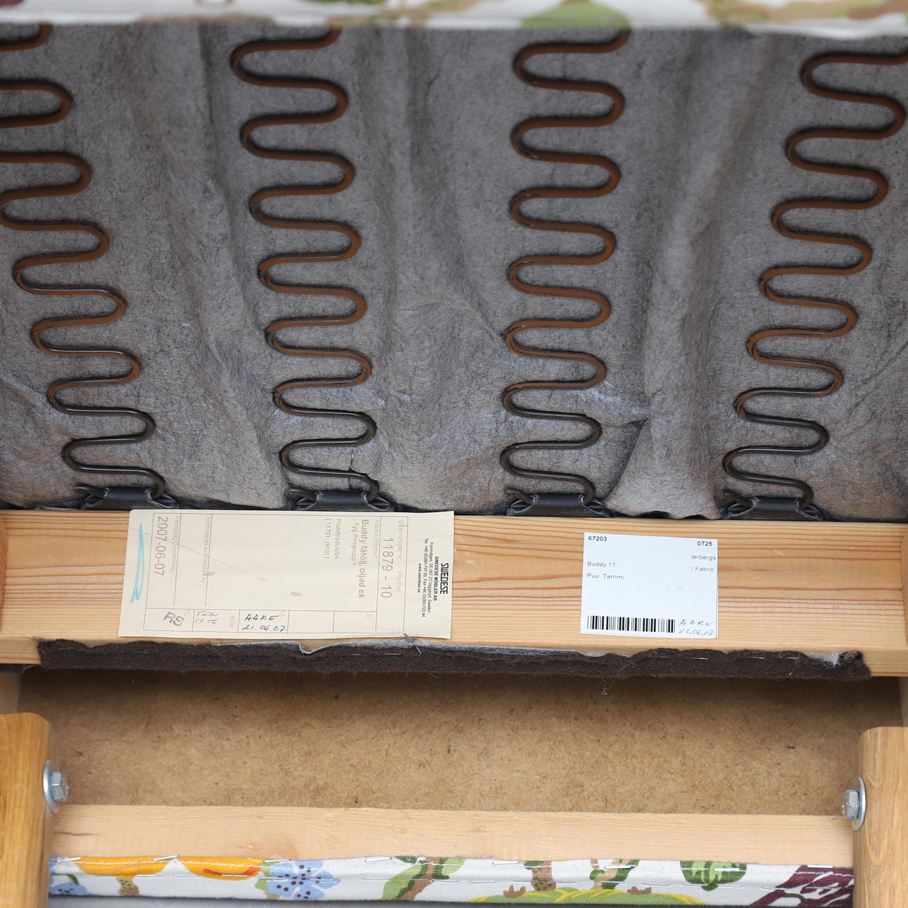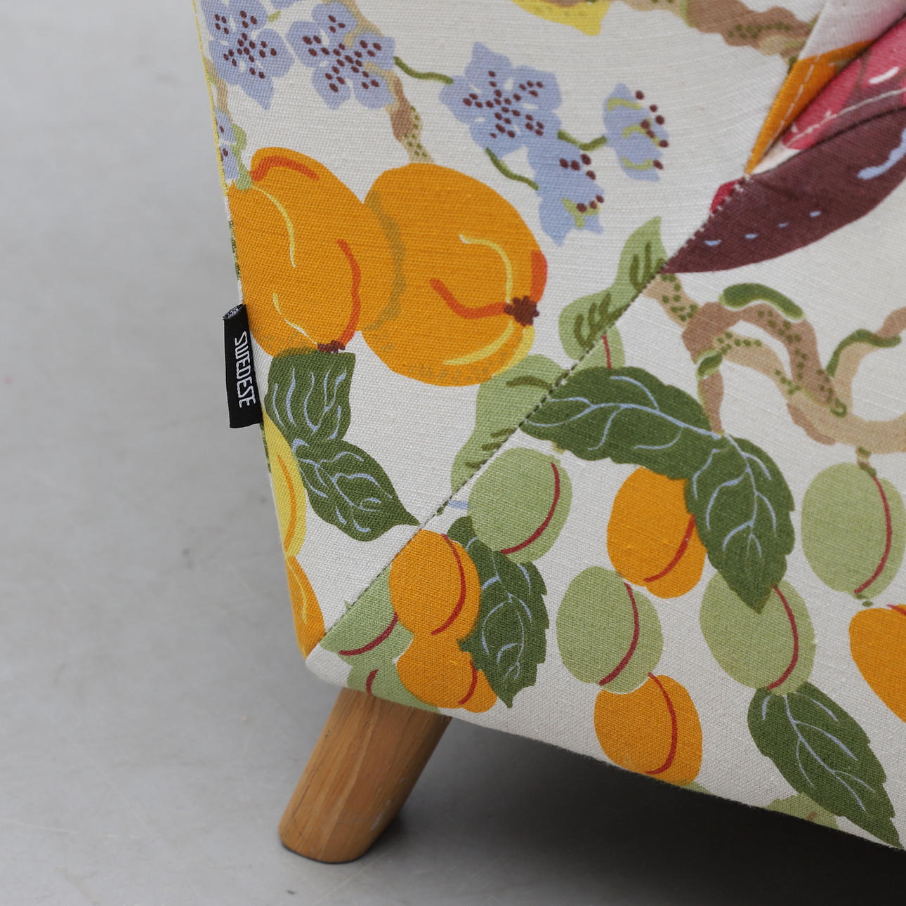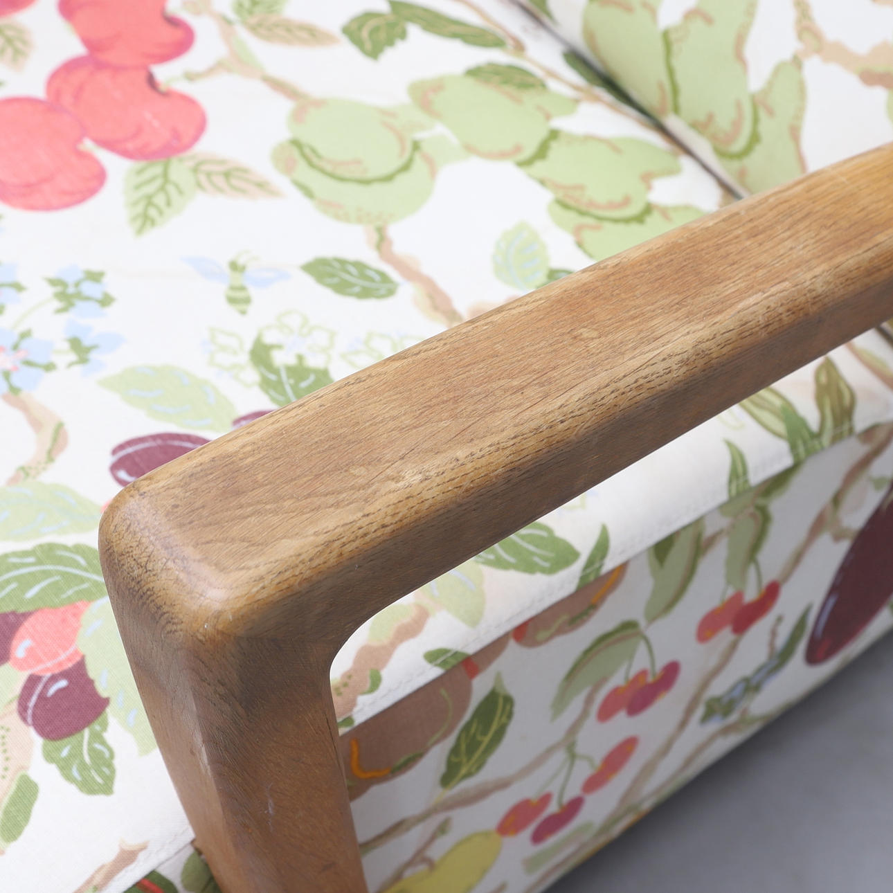 Armlän och ben i ek. Fast stoppad rygg och sits klädd med textil från Jobs. Höjd ca 81 cm.