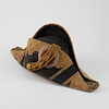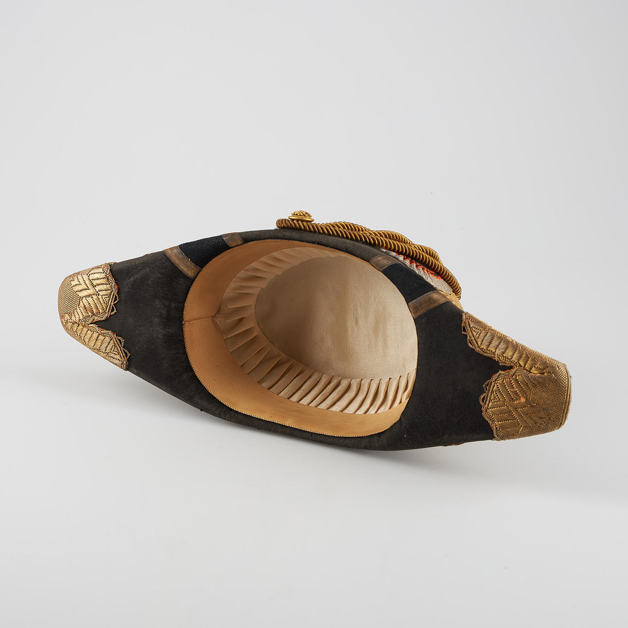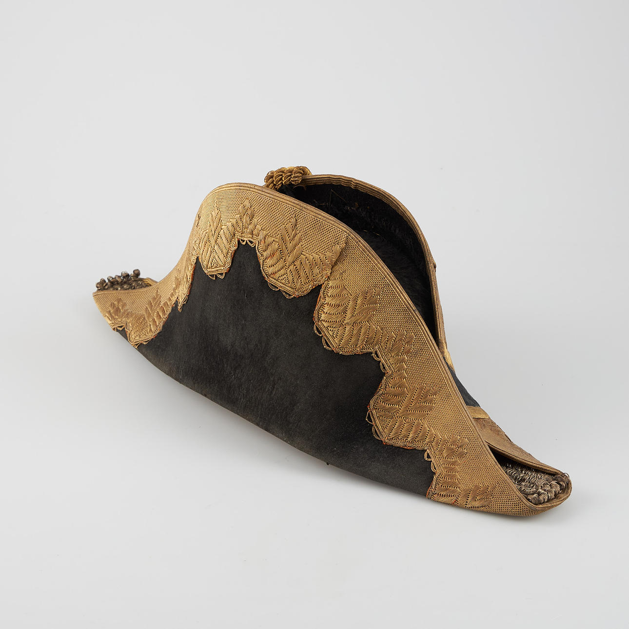 Svart filt, dekorerad med en broderad förgylld fläta och en kokard och knapp med dubbelörn. Sent 1800-tal/tidigt 1900-tal. längd 45 cm, bredd 18 cm, höjd 18 cm.