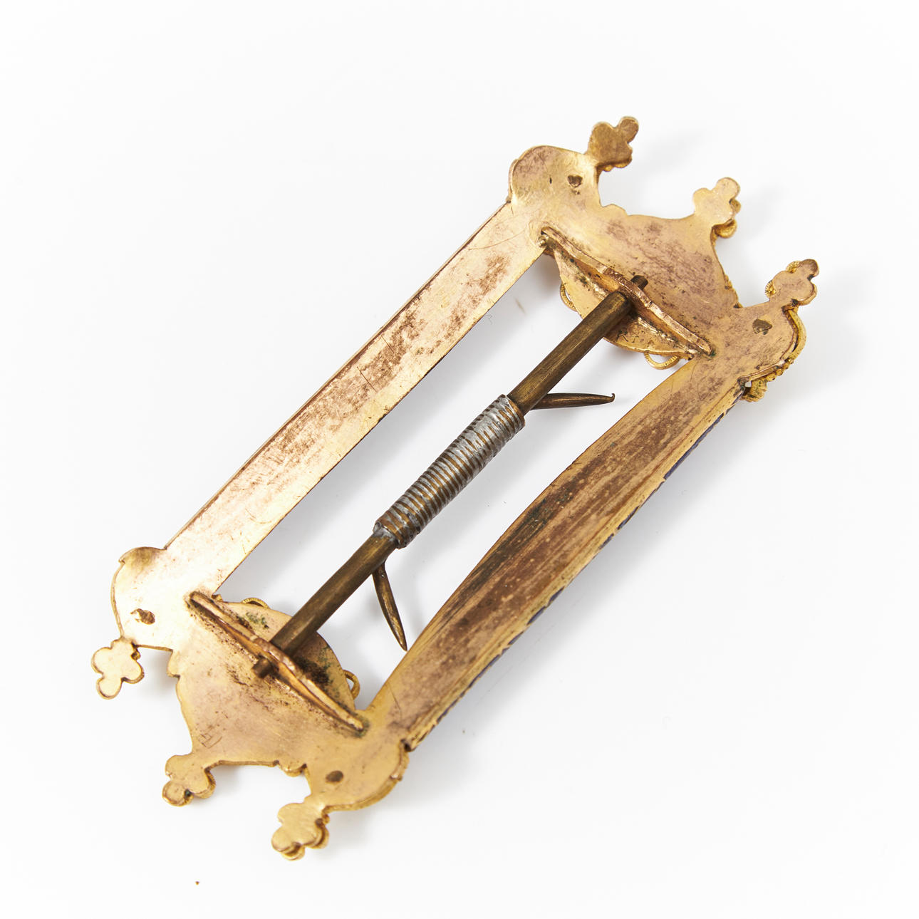 Bältesspänne, nygotik, 1830/40-tal, gulmetall med filigrandekor och blå emalj.